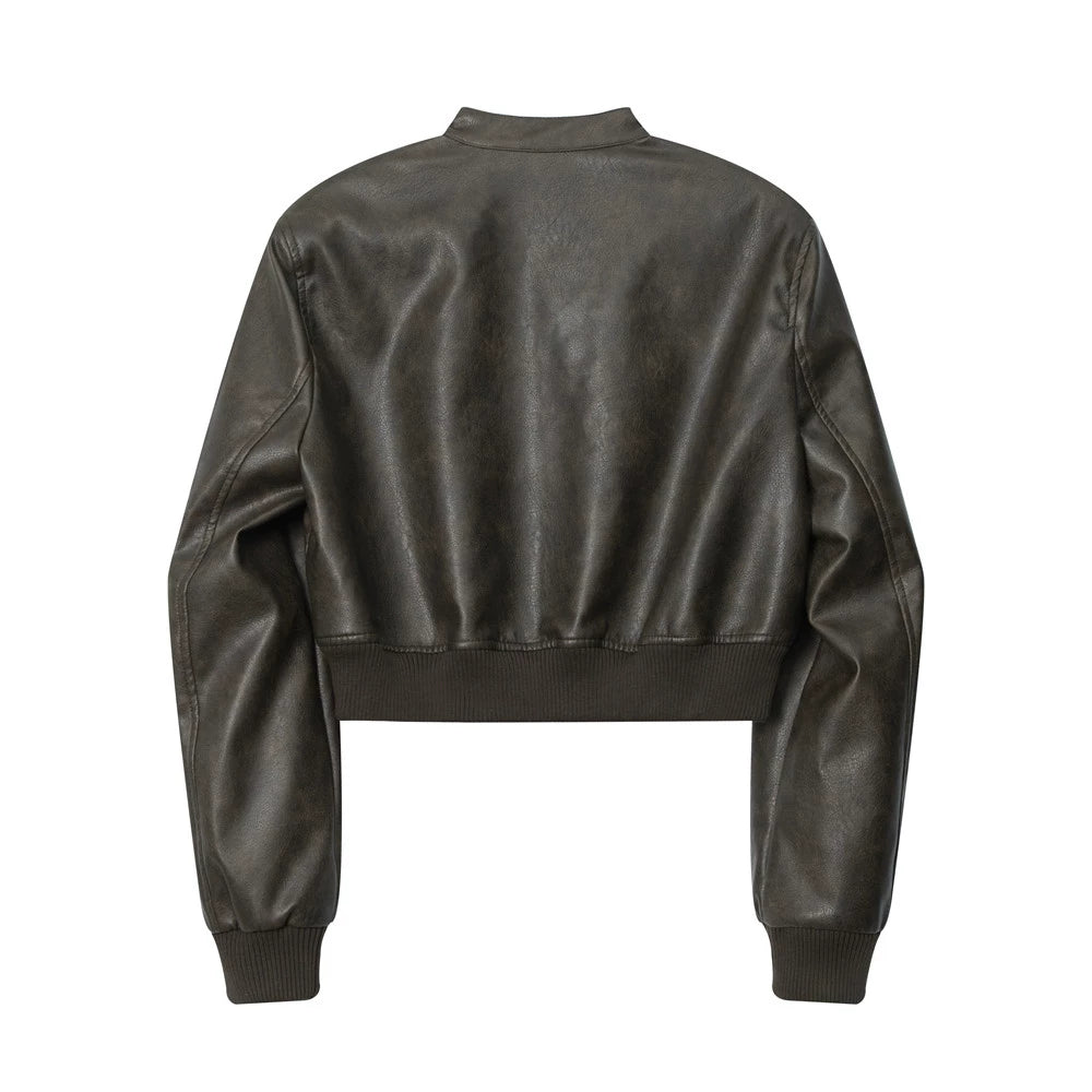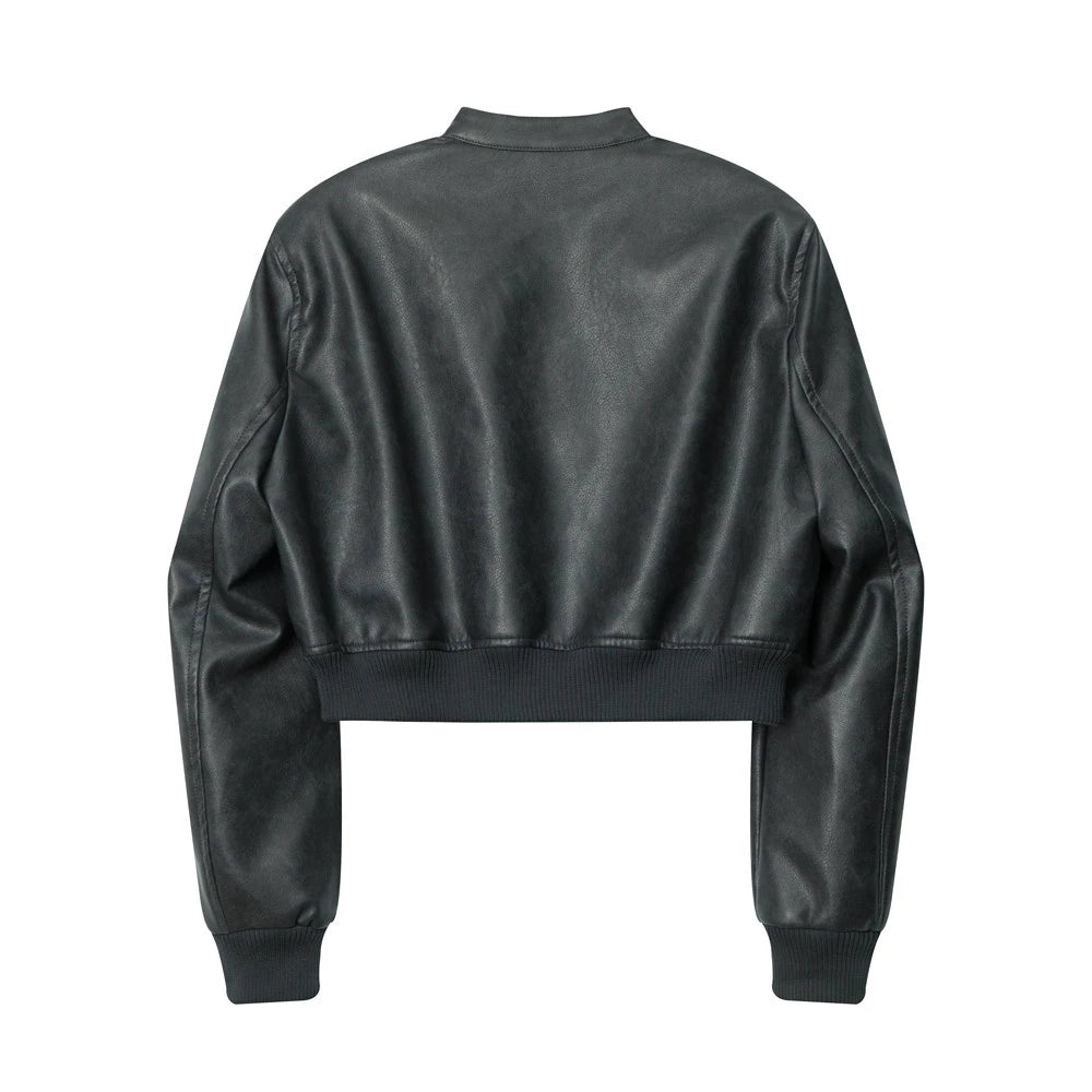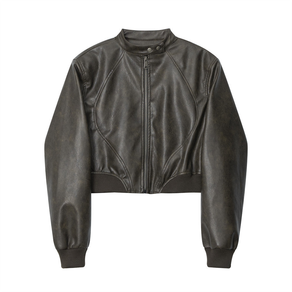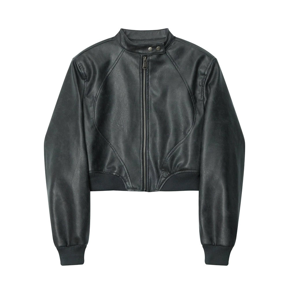 Women Jacket Short Pu Leather Coat Stand Collar Solid Color Racing Suit