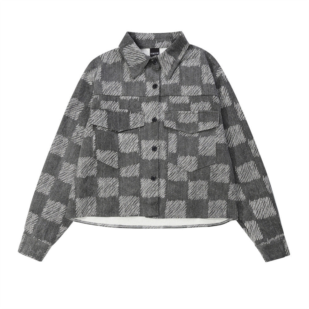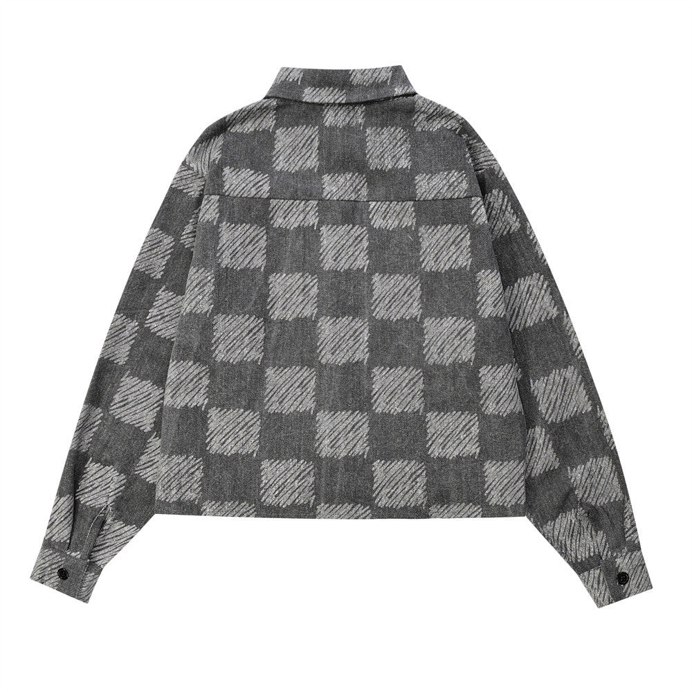 Women Jacket Chessboard Plaid Long Sleeve Shirt Jacket Lapel Pocket Coat