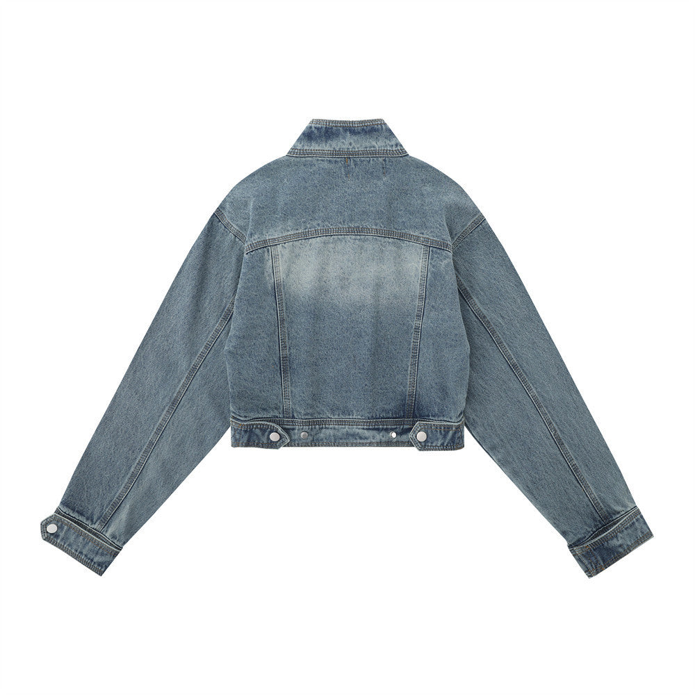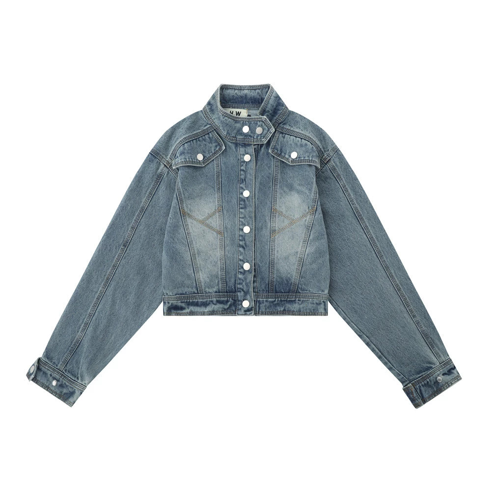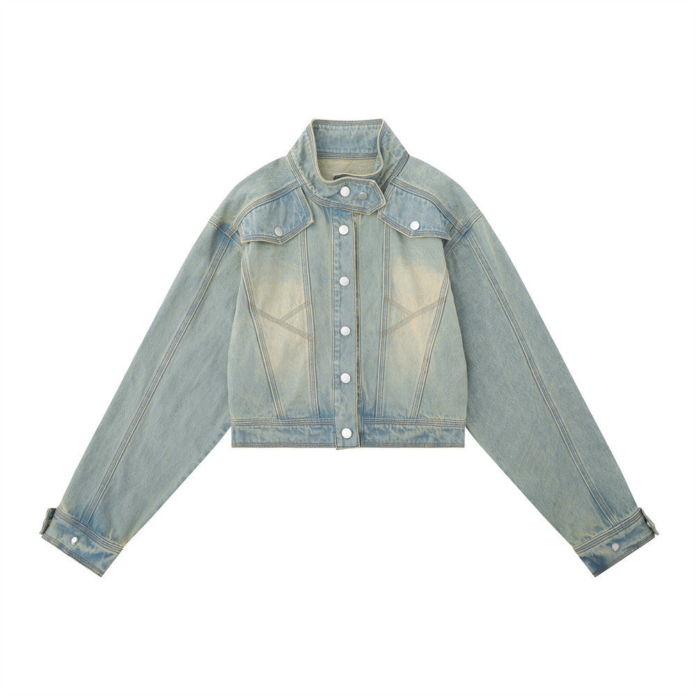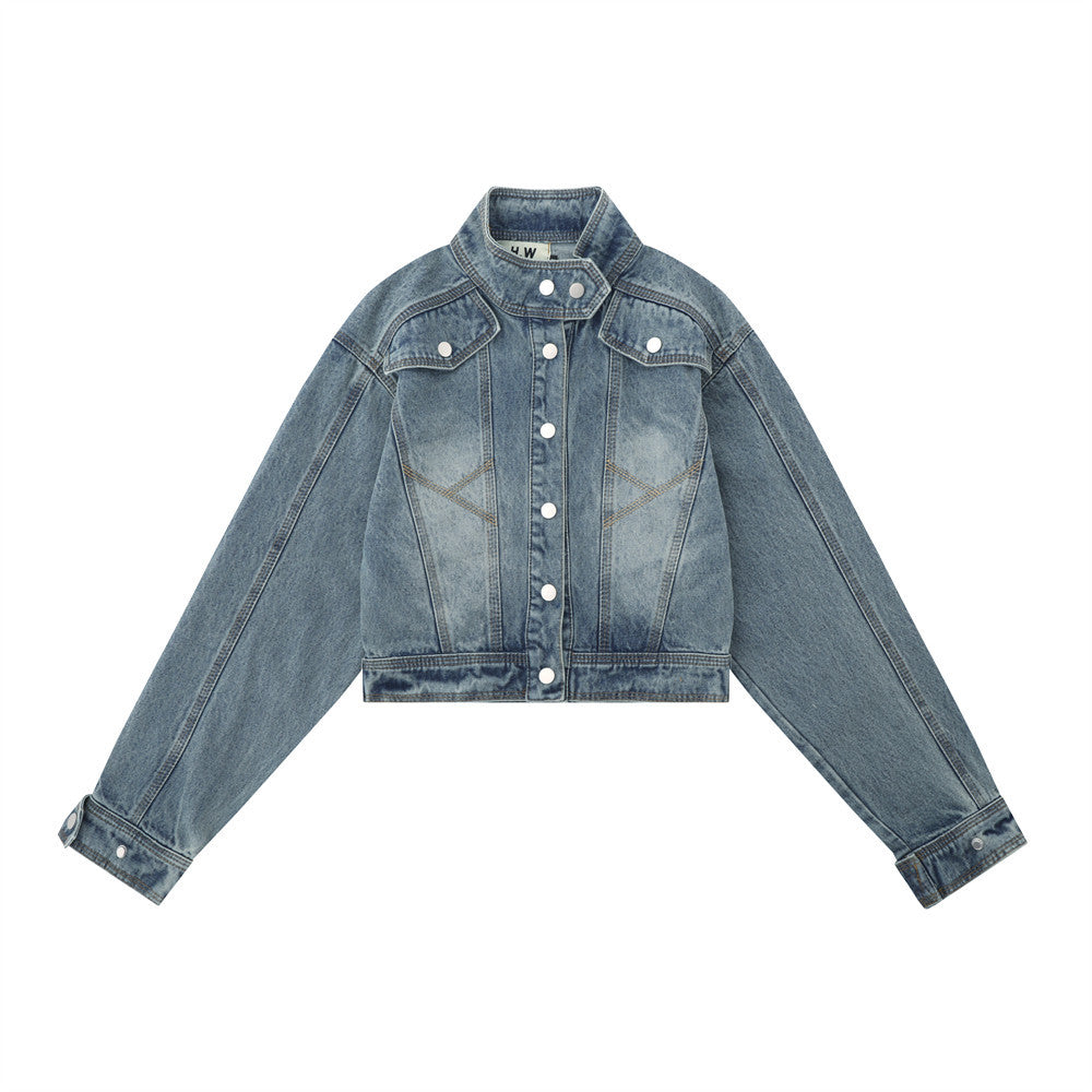 Women Jacket Distressed Short Denim Jacket Autumn Leisure Stand Collar Denim Clothes Jacket