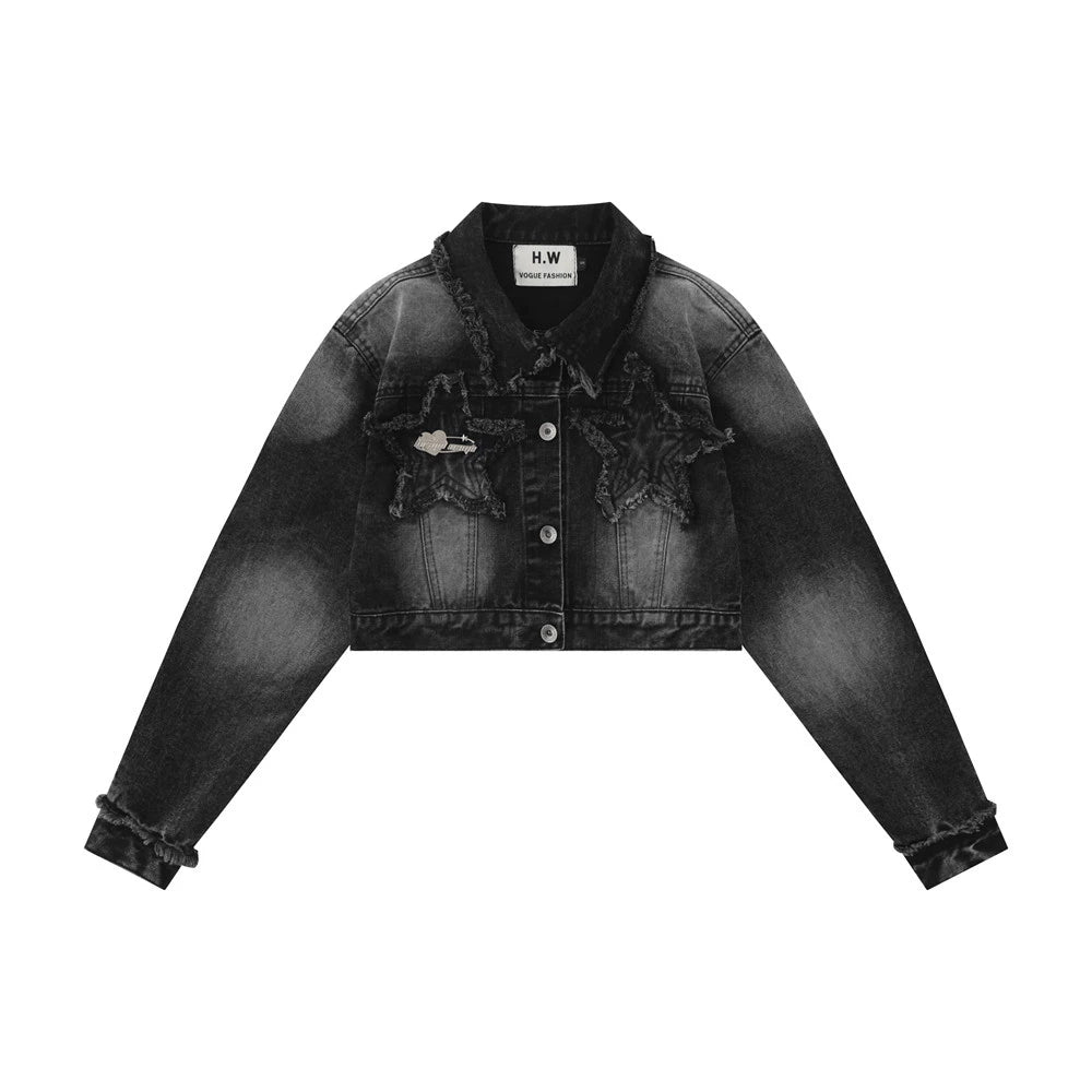 Women Jacket Five-Pointed Star Affixed Cloth Embroidered Short Denim Jacket