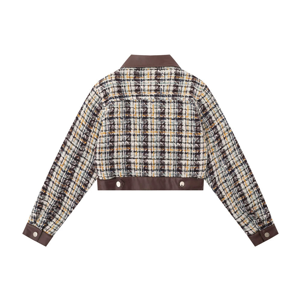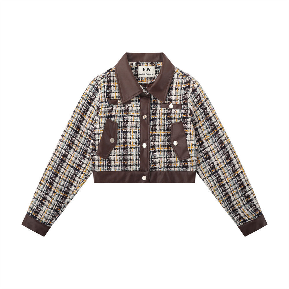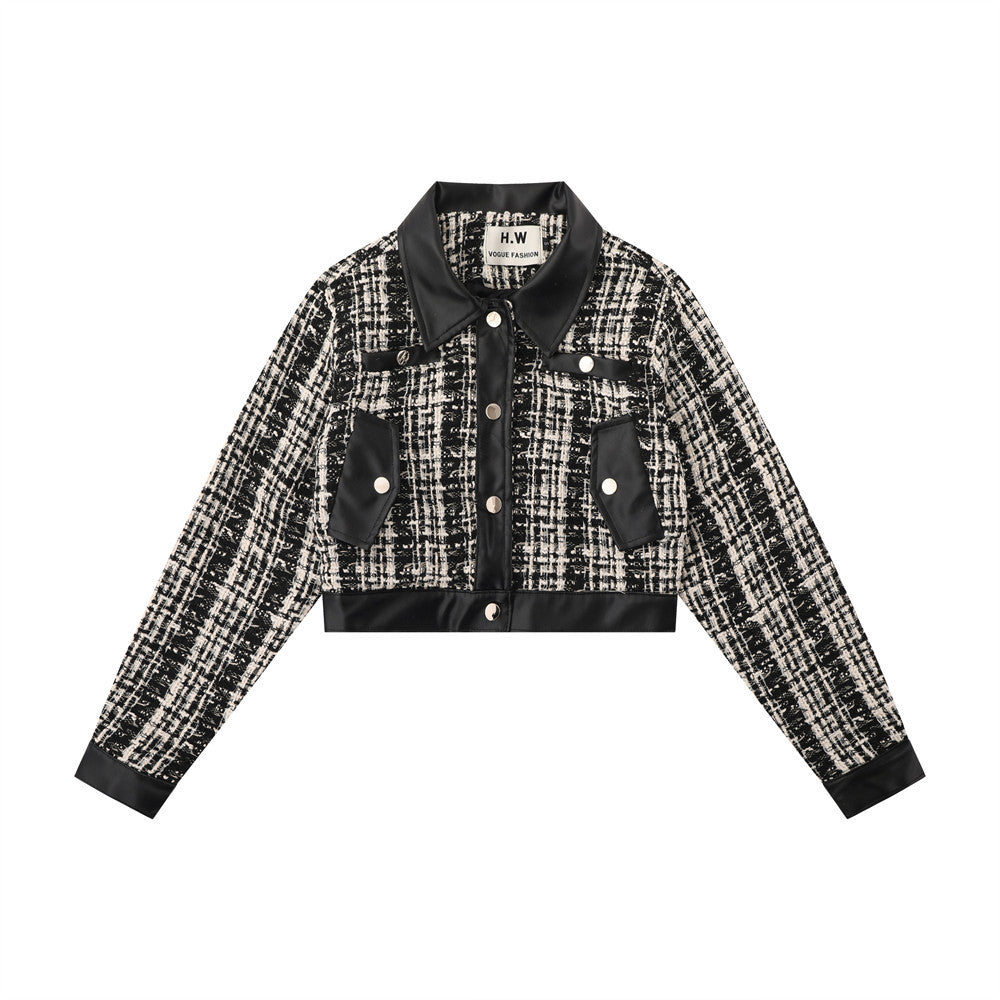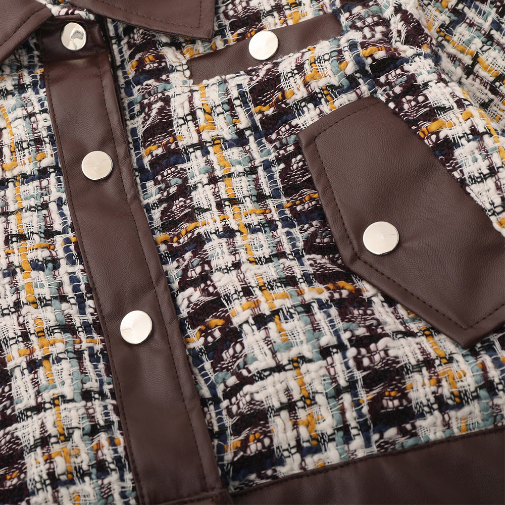 Women Jacket Houndstooth Fall Lapels Long Sleeve Stitching Leather Coat