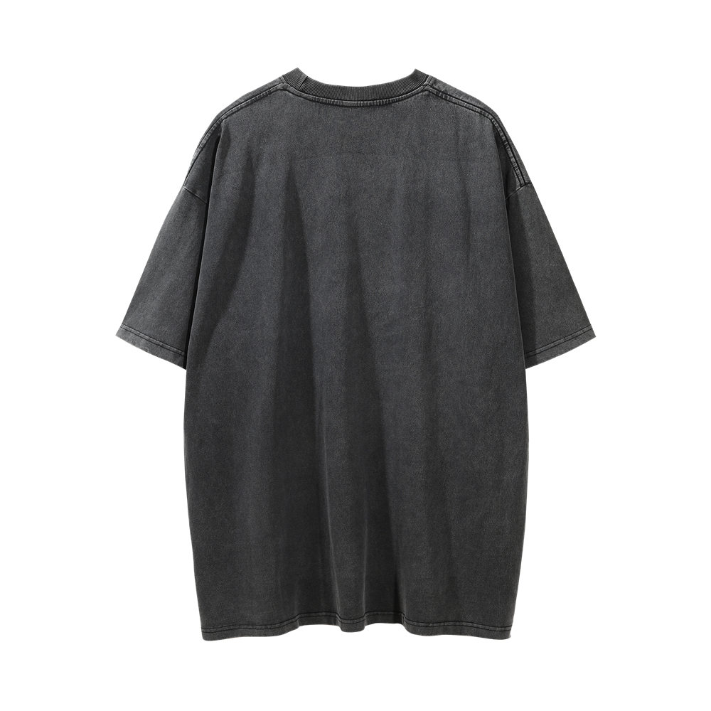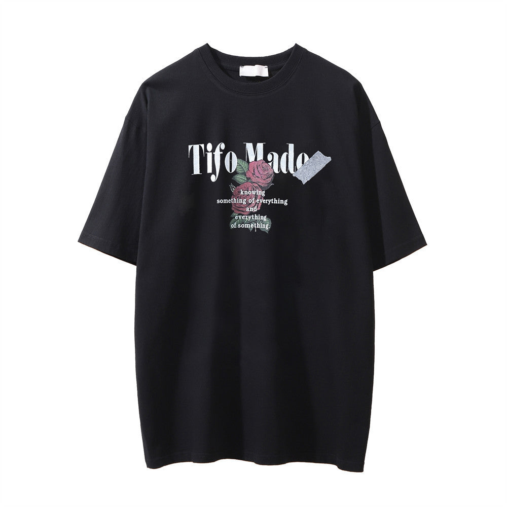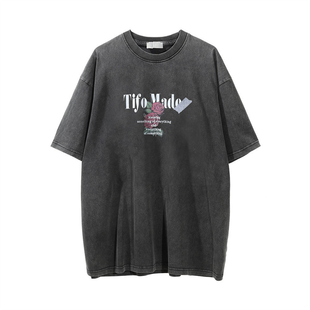 Men Vintage T-Shirt Rose Letter Print Washed and Worn Short Sleeve T-shirt
