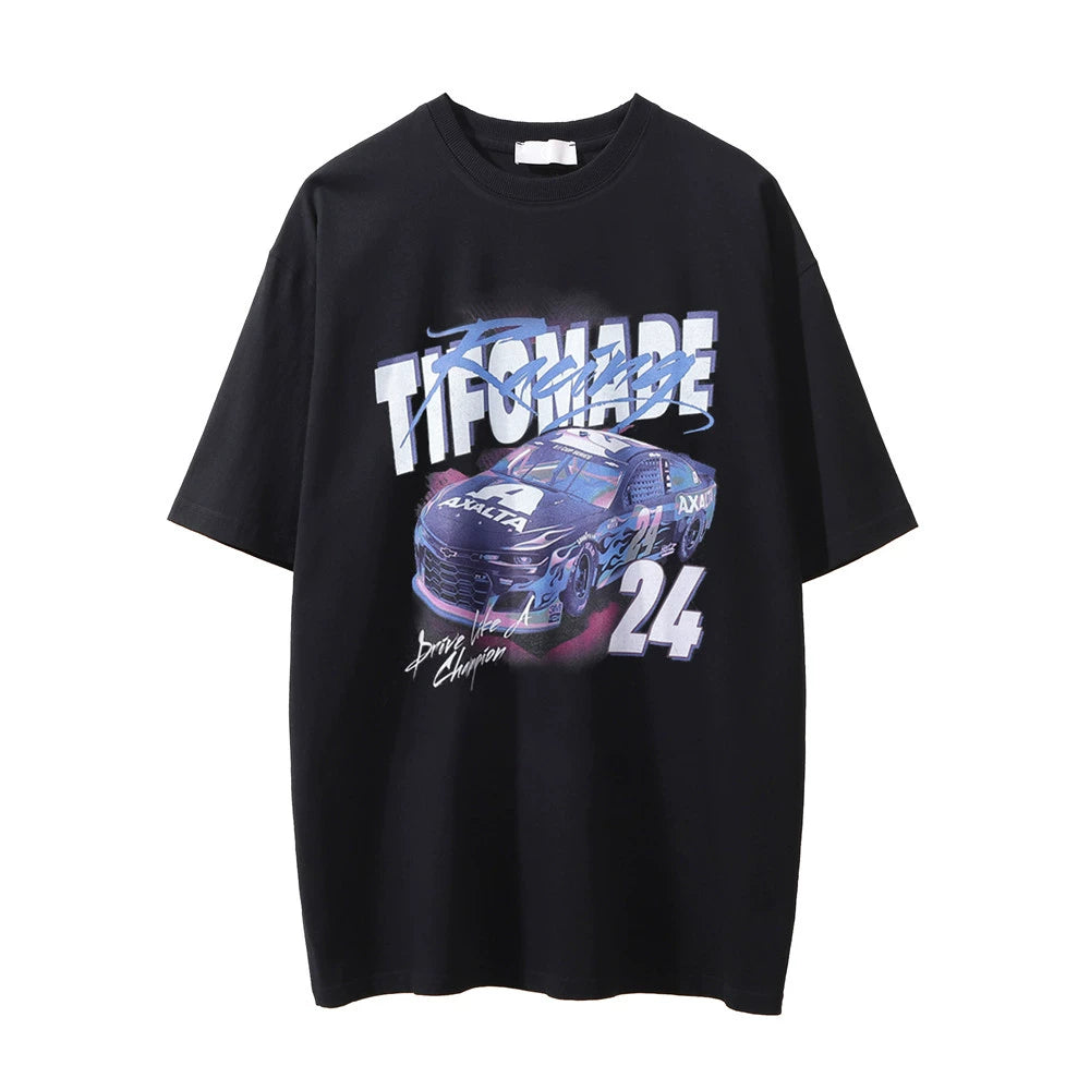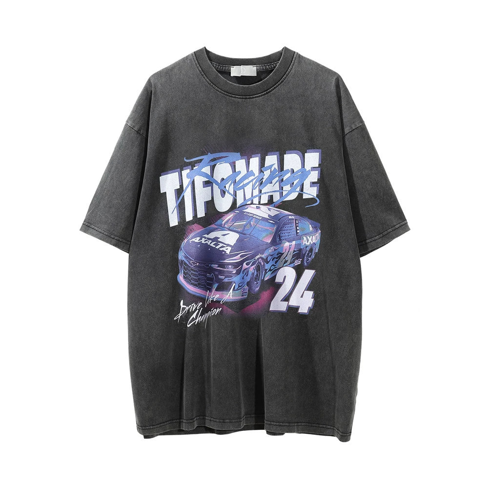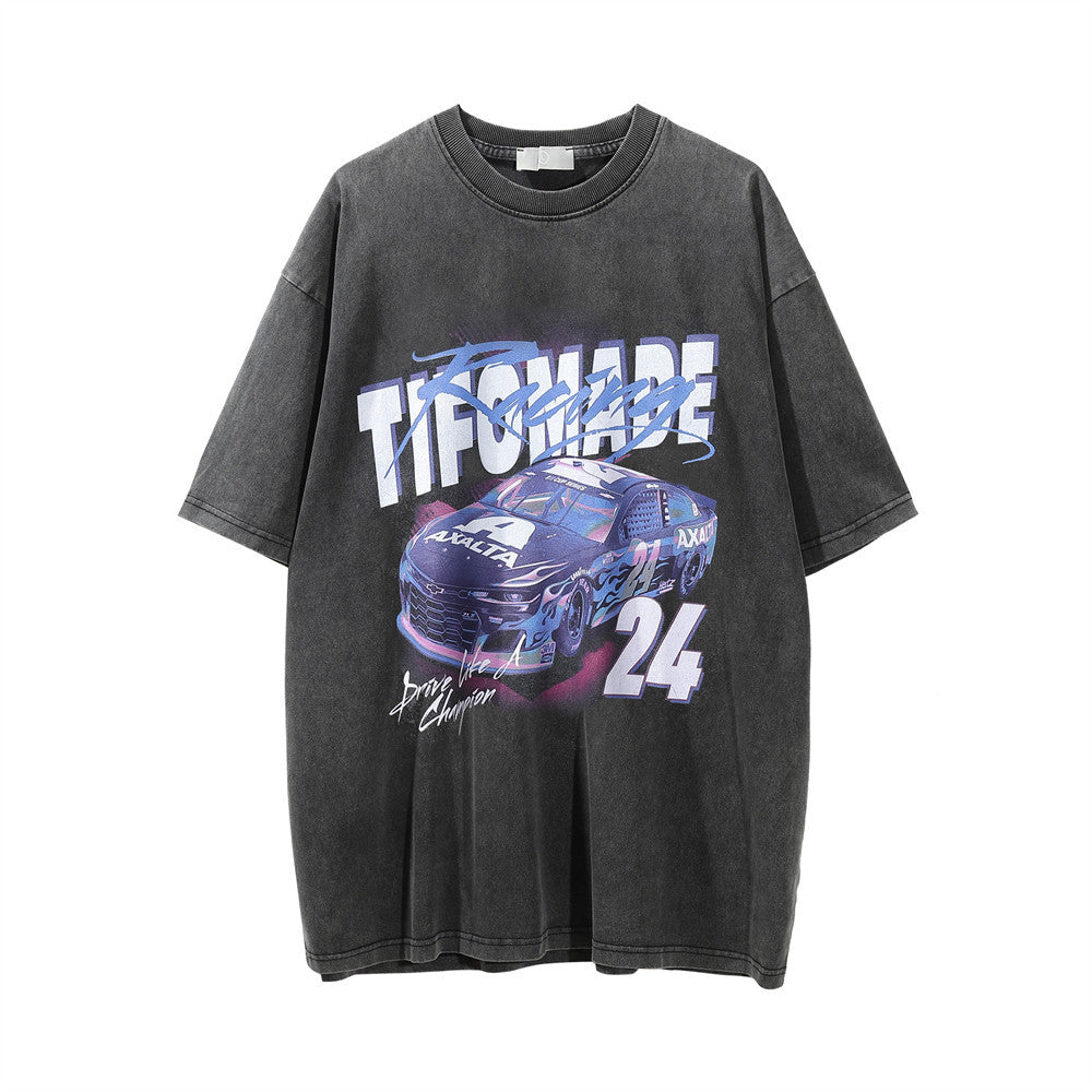 Men Vintage T-Shirt Racing Printed Washed and Worn Short Sleeve T-shirt