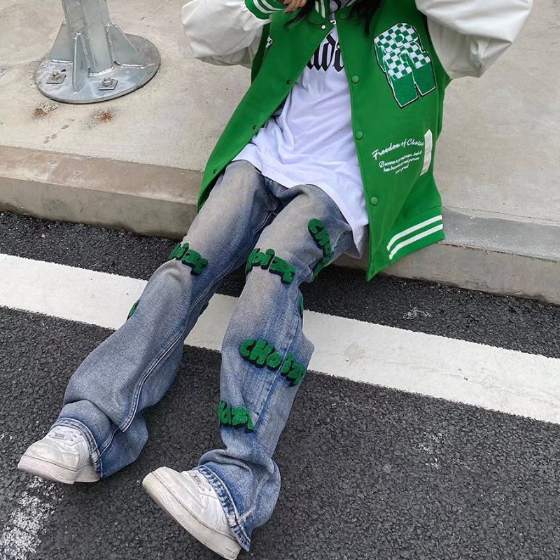 Men Jeans Letter Embroidered Jeans Hiohop Retro Washed Loose Trousers