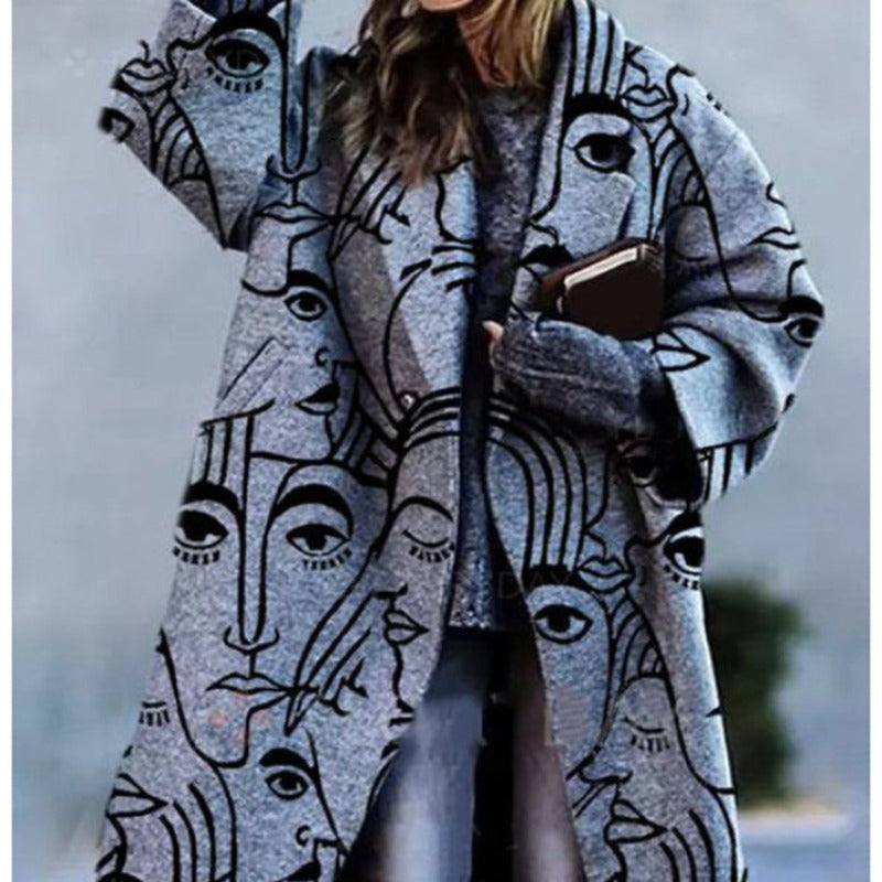 Women Trench Coat Autumn Long Sleeve Turn-down Collar Coat Printed Woolen plus Size Trench Coat