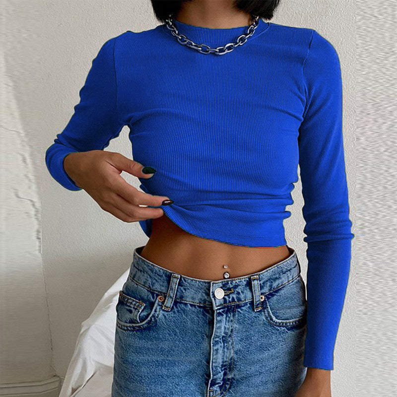 Women Knit Top Rib round-Neck Solid Color T-shirt Crop-Top Tight-Fitting Long Sleeve Short Top