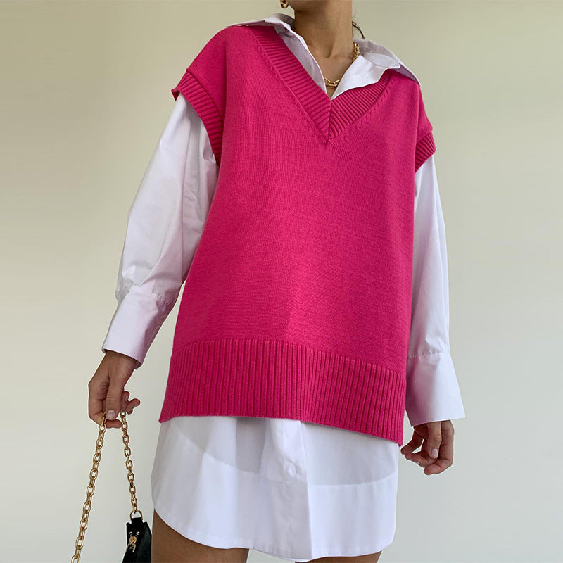 Ladies Leisure Knitwear Loose V-neck Knitted Sweater Vest Autumn and Winter Sleeveless Knitwear