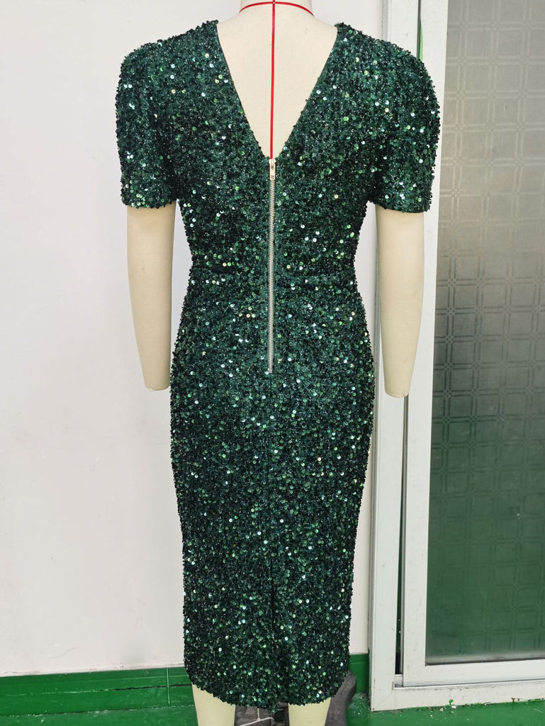 Women Evening Gown Sexy Retro Green Sequins Dress