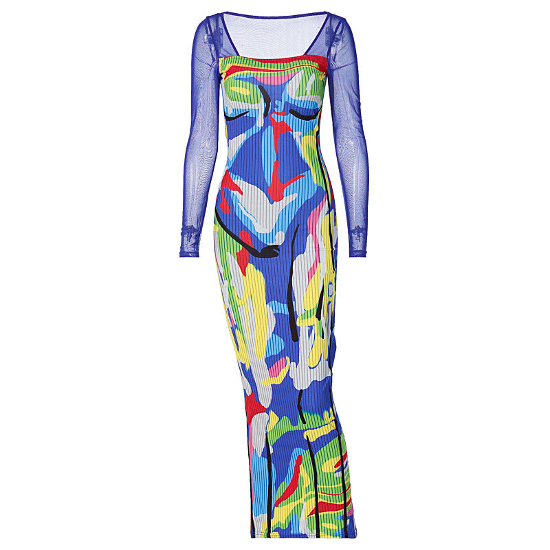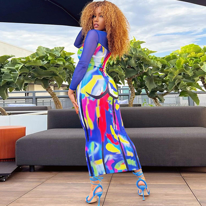 Women Dresses Fall Printed Mesh Slim Fit Patchwork Long Sleeve Dress