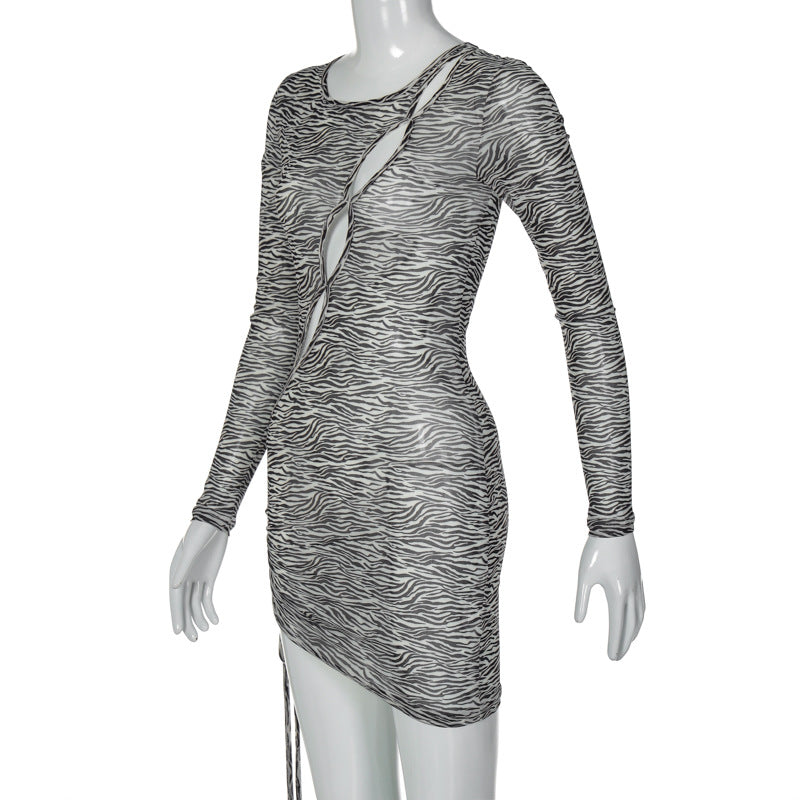 Women Dresses Autumn Sexy Mesh Floral Print Hollow out Long Sleeve Dress