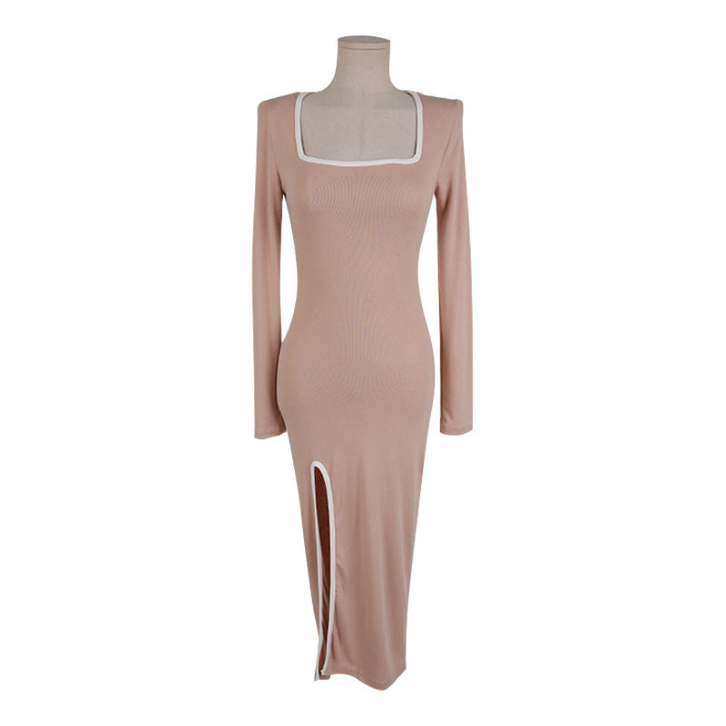 Women Maxi Dress Autumn and Winter Square Collar Slit Dress