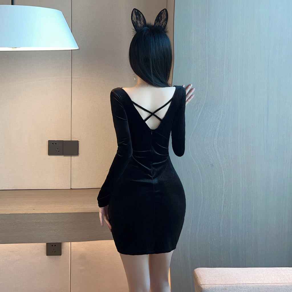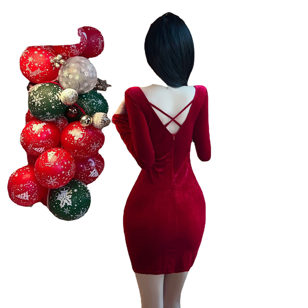 Women Maxi Dress Autumn Winter Sexy Deep V Lace Pleuche Long Sleeve Sheath Dress