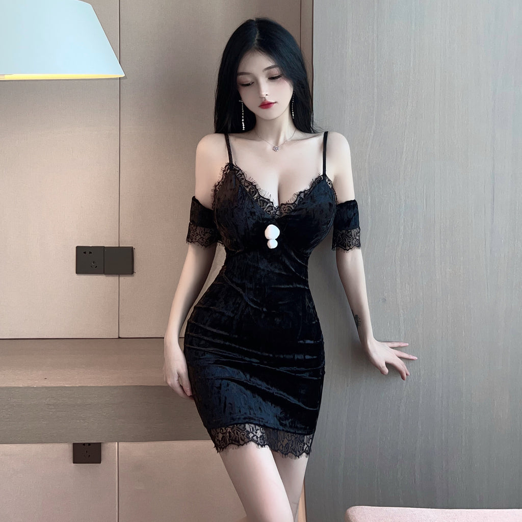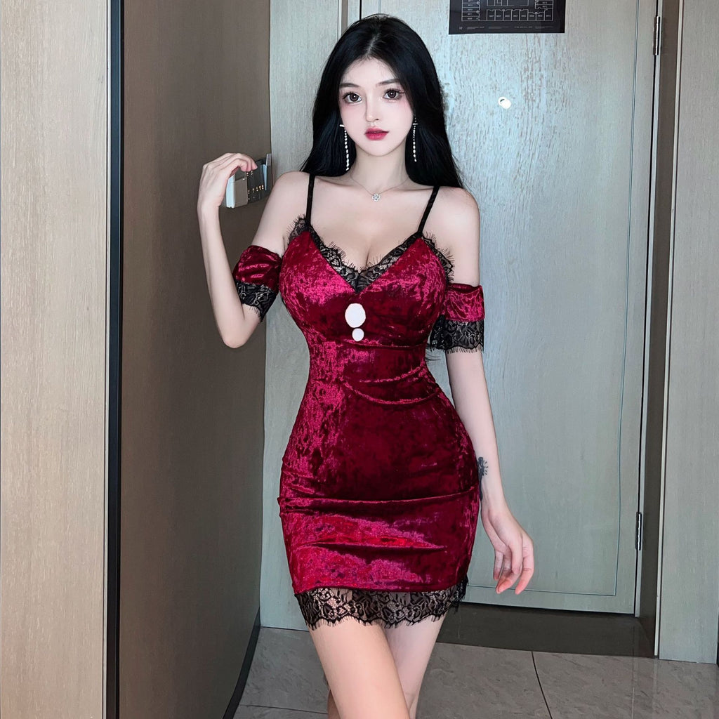 Women Maxi Dress Autumn Winter Sexy off-Shoulder Lace Hip Spaghetti Straps Dress