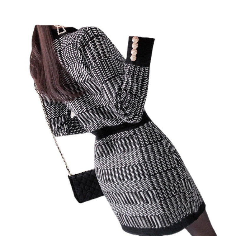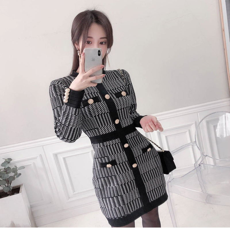Women Maxi Dress Autumn Winter Retro Houndstooth Long Sleeve Knitted Dress Hip Skirt