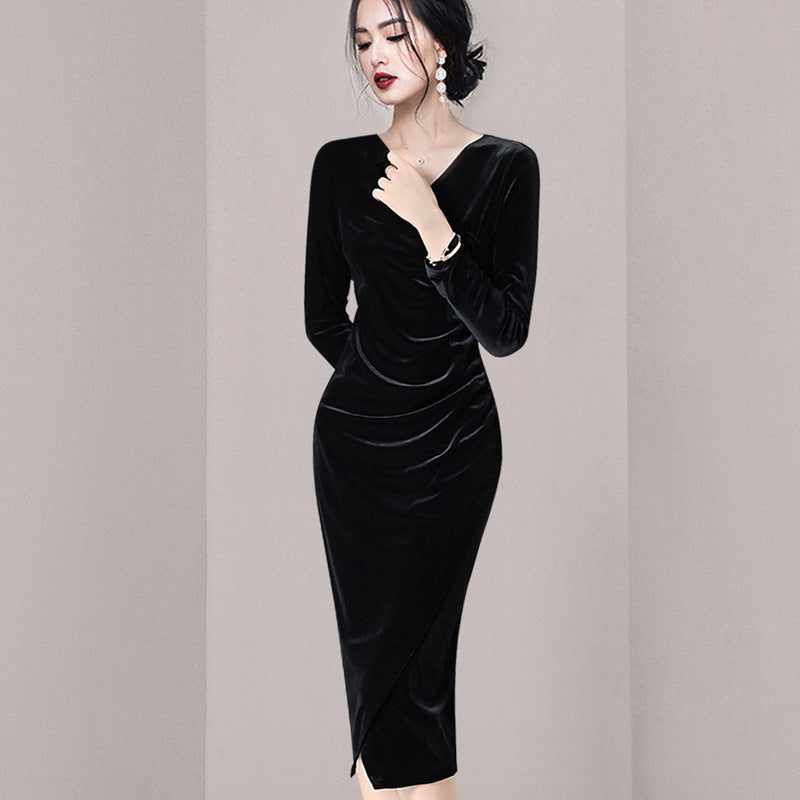 Women Maxi Dress Autumn and Winter V-neck Black Dress Sheath Pleuche Dress