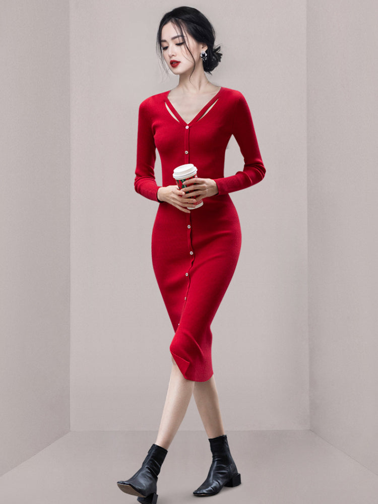 Women Maxi Dress Autumn and Winter V-neck Retro Hip-Wrapped Dress