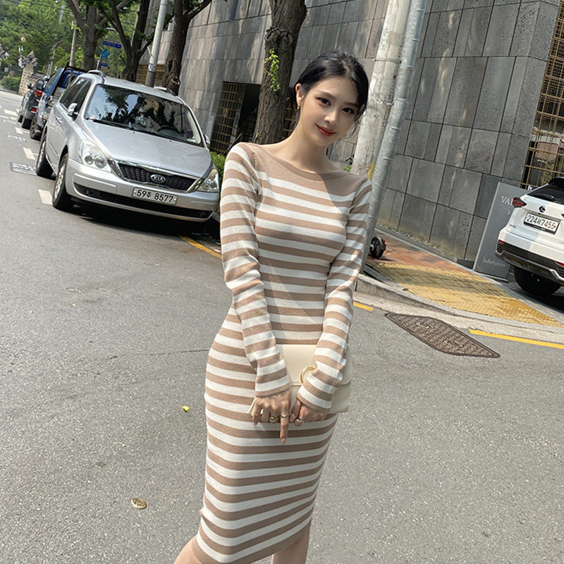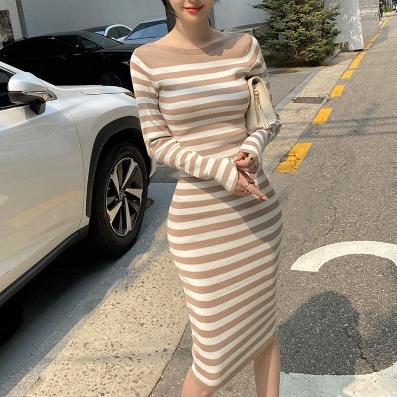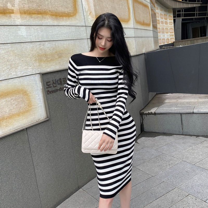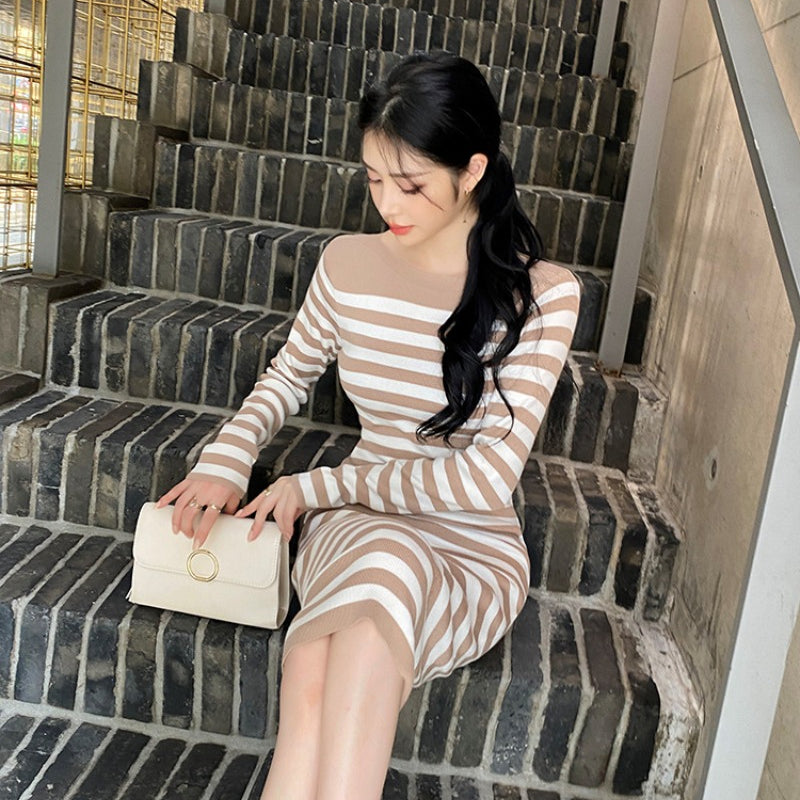 Women Maxi Dress Autumn Striped Long Sleeve Slim Fit Hip Knitwear Dress