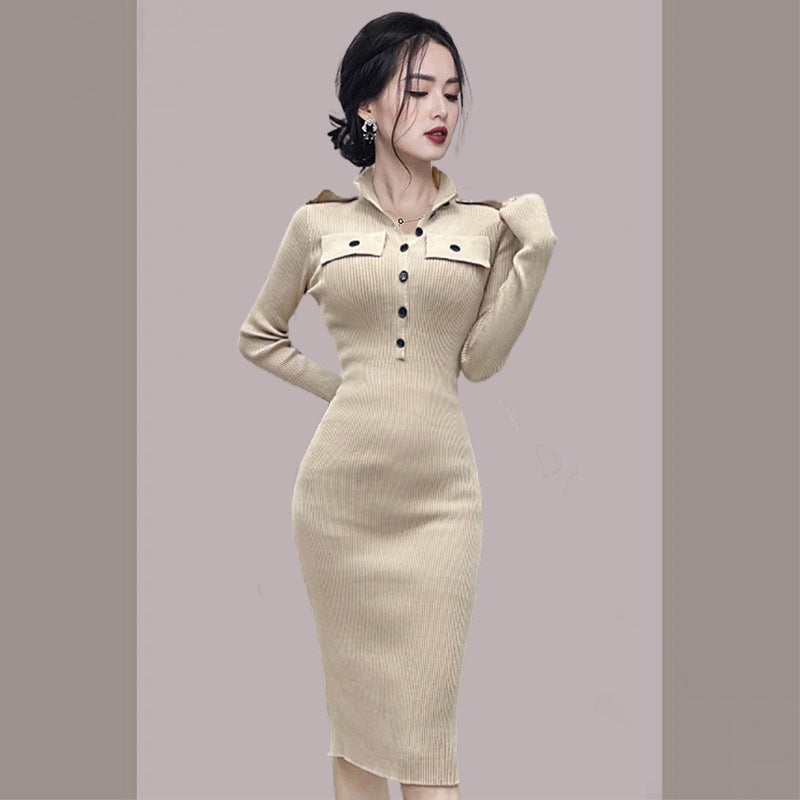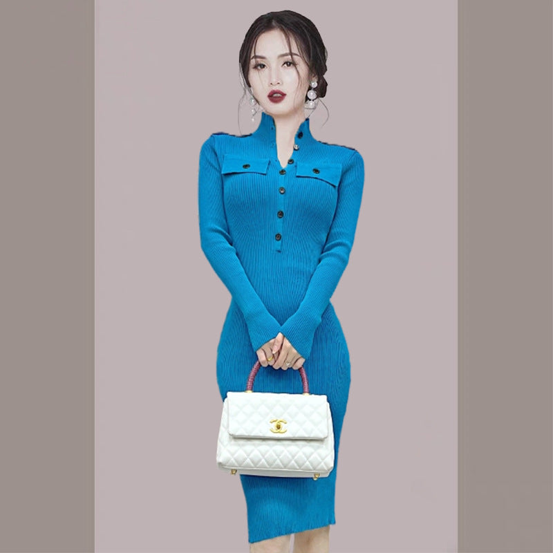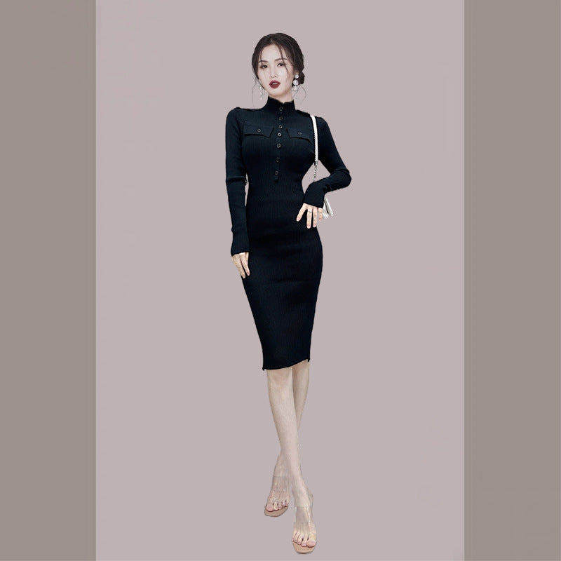 Women Maxi Dress Autumn and Winter Turtleneck Long Sleeve Narrow Knitted Dress