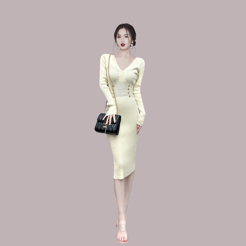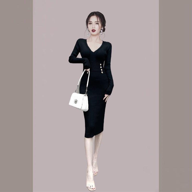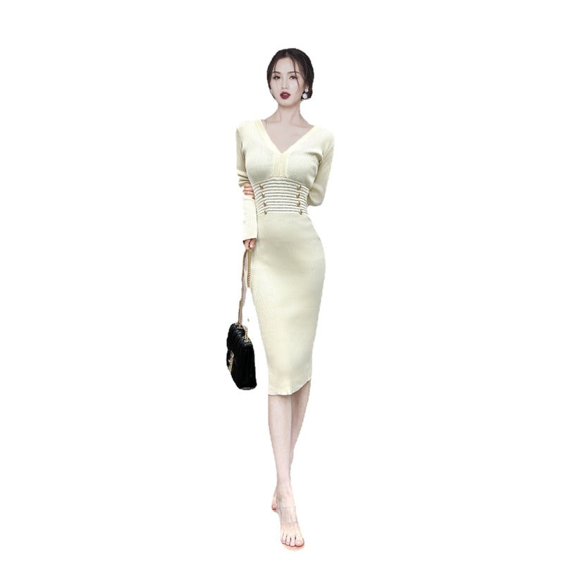 Women Maxi Dress Spring and Autumn V-neck Double Breasted Knitted Dress Hip Skirt