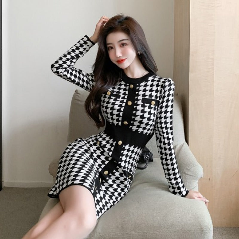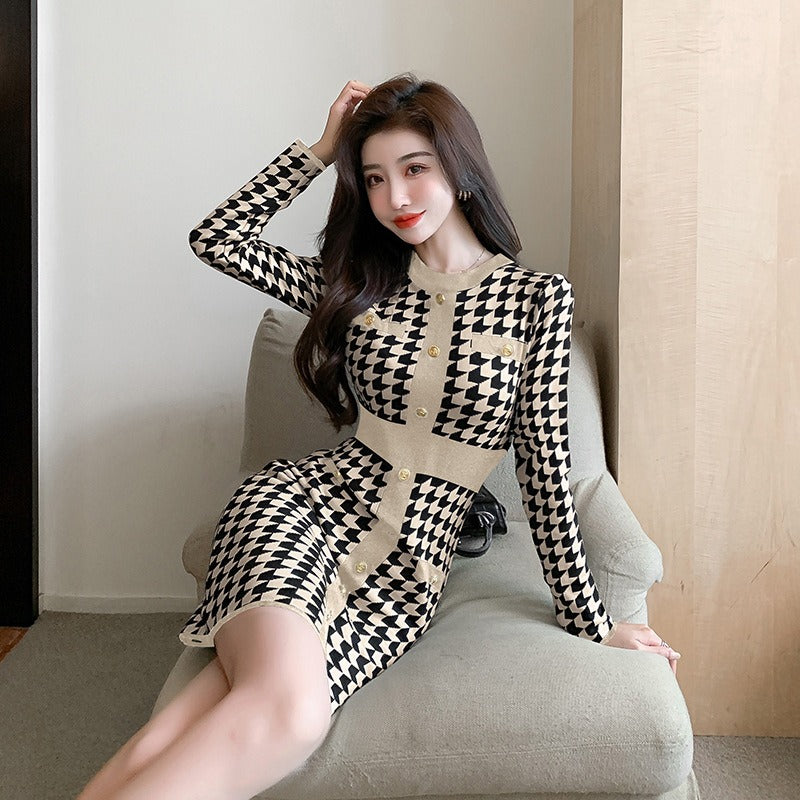 Women Maxi Dress Fall/Winter Single-Breasted Long Sleeve Slim Fit Hip Knitwear Dress