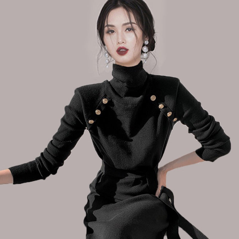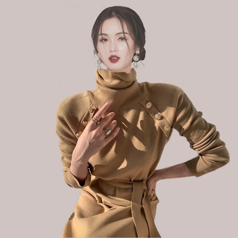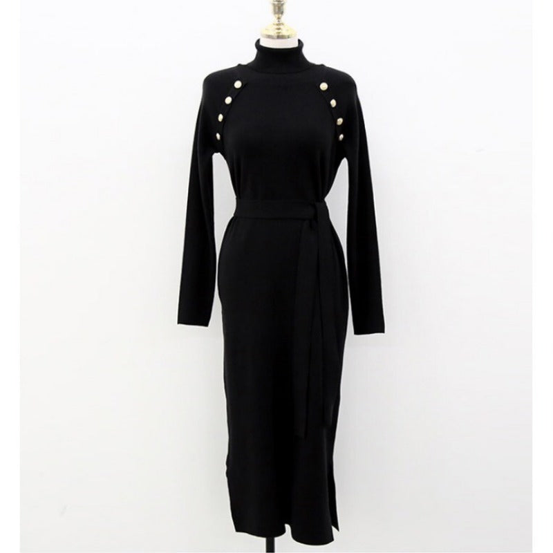 Women Maxi Dress Autumn Winter Retro Turtleneck Buttons Long Sleeve Knitted Dress