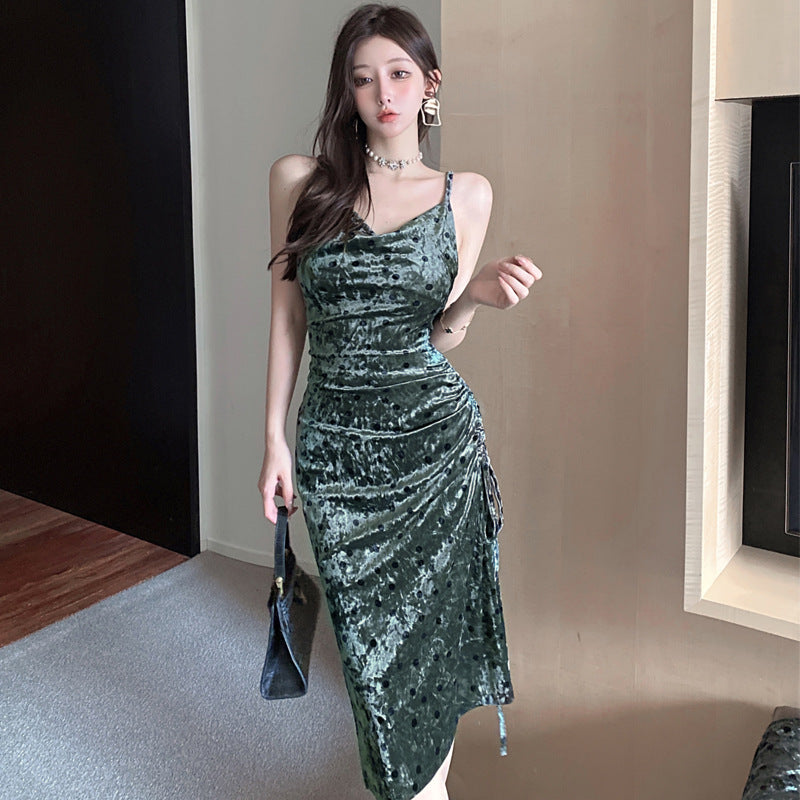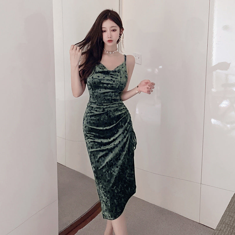 Women Maxi Dress Autumn Sexy Polka Dot Gold Velvet Long Sheath Dress