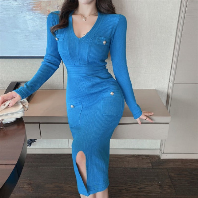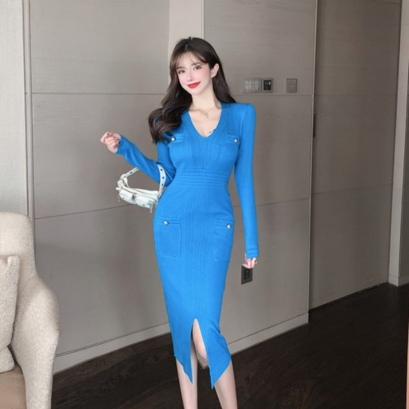 Women Maxi Dress Autumn and Winter V-neck Long Sleeve Narrow Long Slit Dress