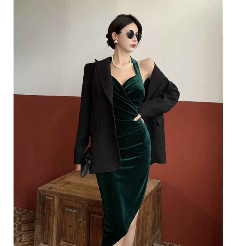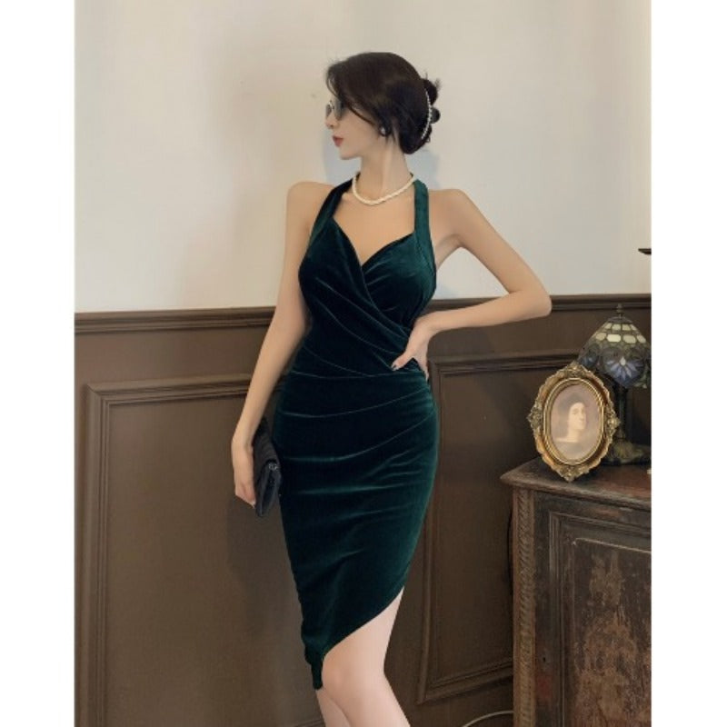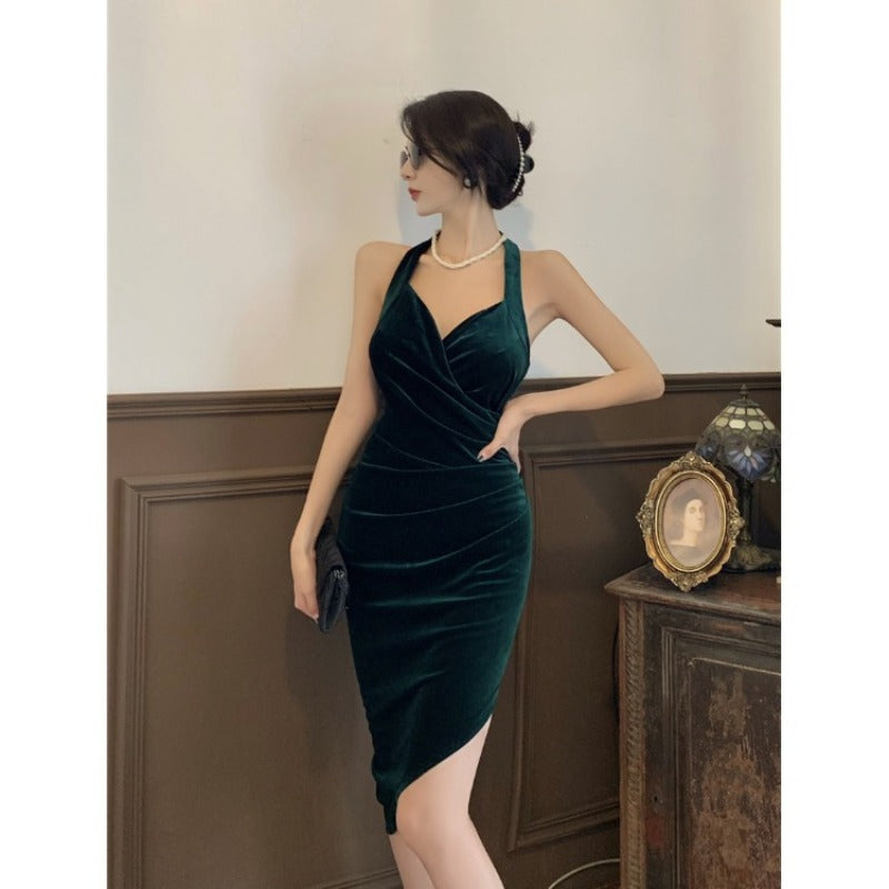 Women Maxi Dress Autumn Winter Retro Velvet Backless Dress