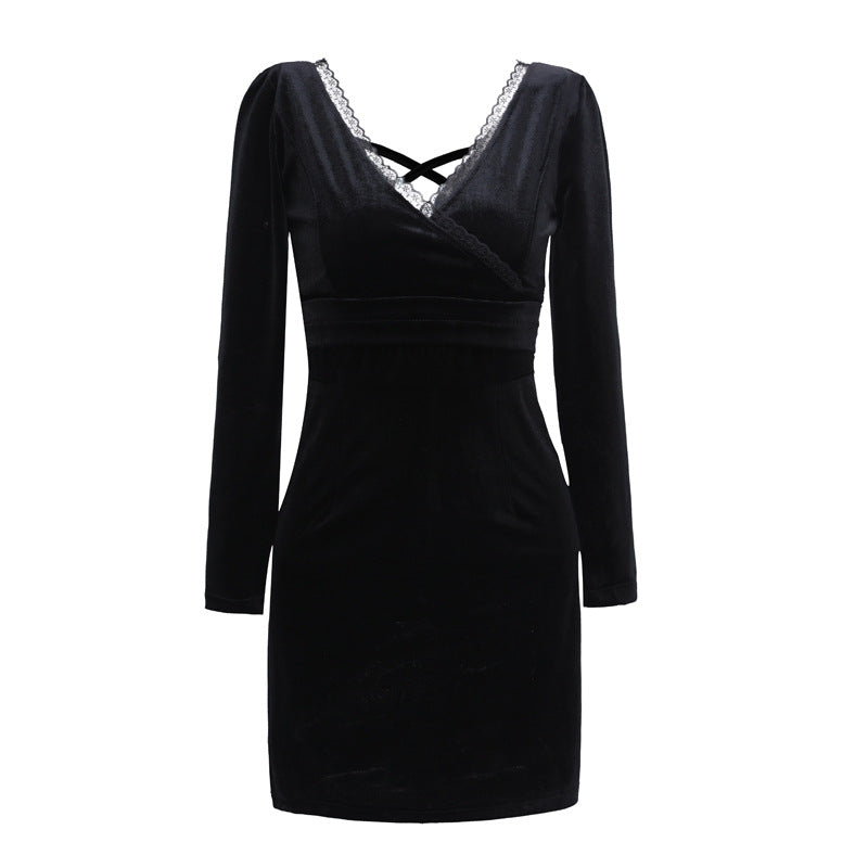 Women Maxi Dress Autumn Winter Sexy V-neck Lace Sheath Pleuche Dress