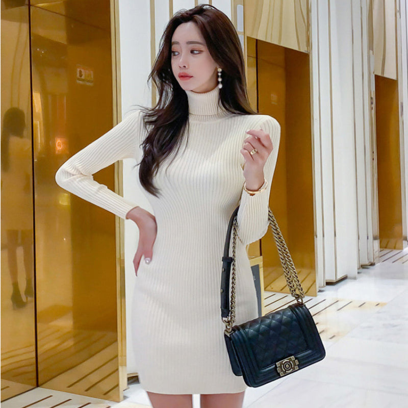 Women Maxi Dress Autumn and Winter High Collar Slim Fit Long Sleeves Knitted Dress
