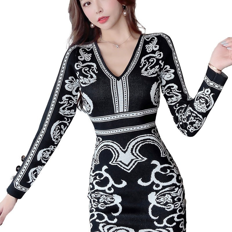 Women Maxi Dress Autumn Winter Sexy Long Sleeve V-neck Hip Knitted Dress