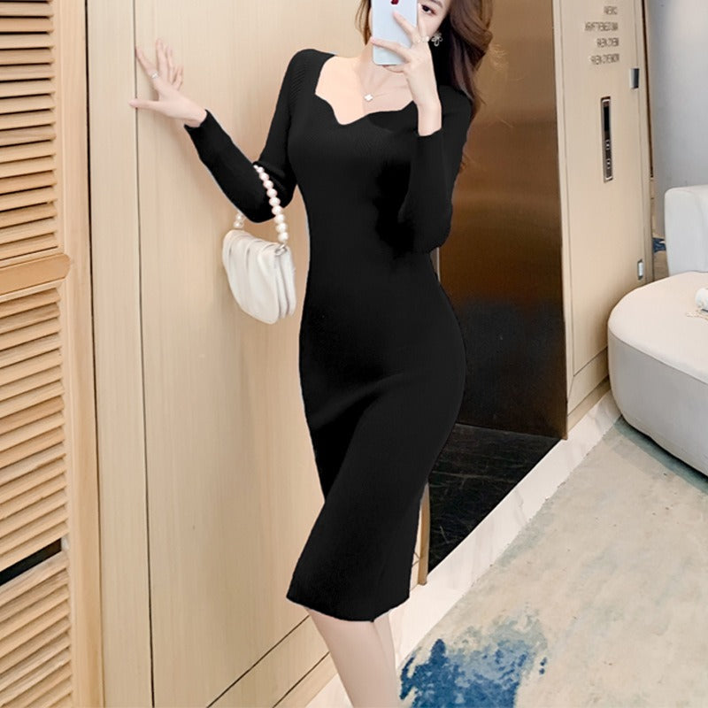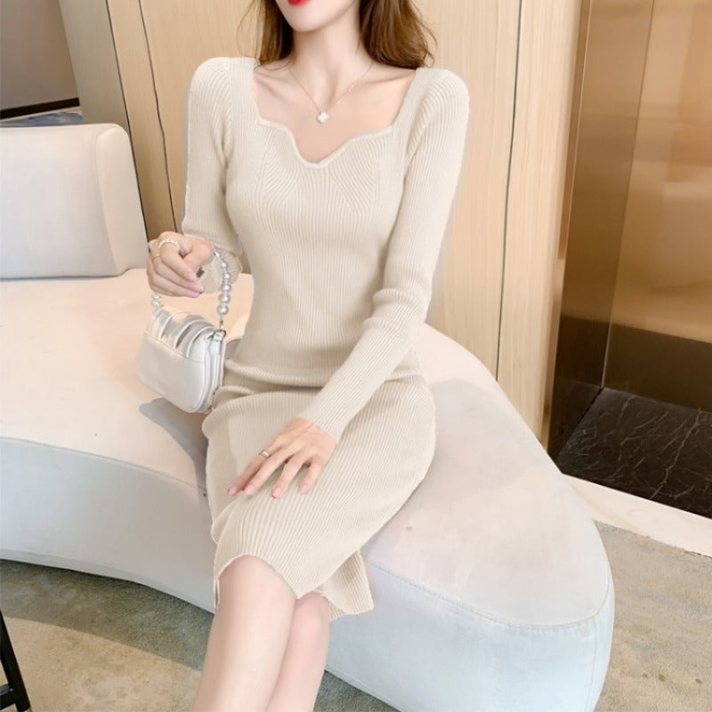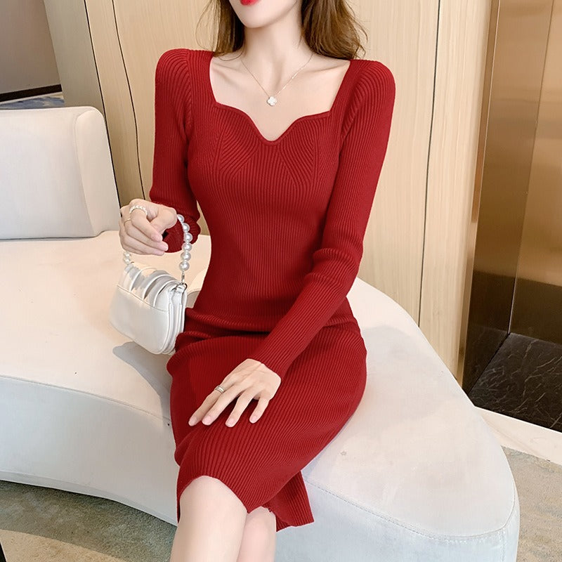 Women Maxi Dress Autumn and Winter V-neck Long Sleeve Mid-Length Knitted Dress