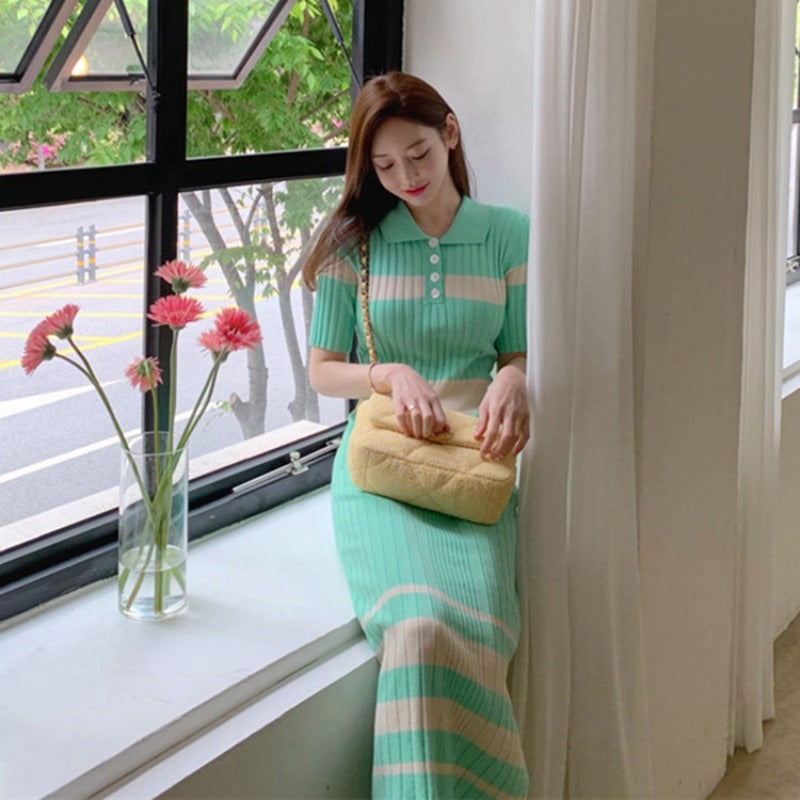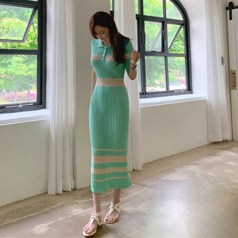 Women Maxi Dress Spring and Autumn Stripes Lapel Slim-Fit Short-Sleeved Knitted Long Dress