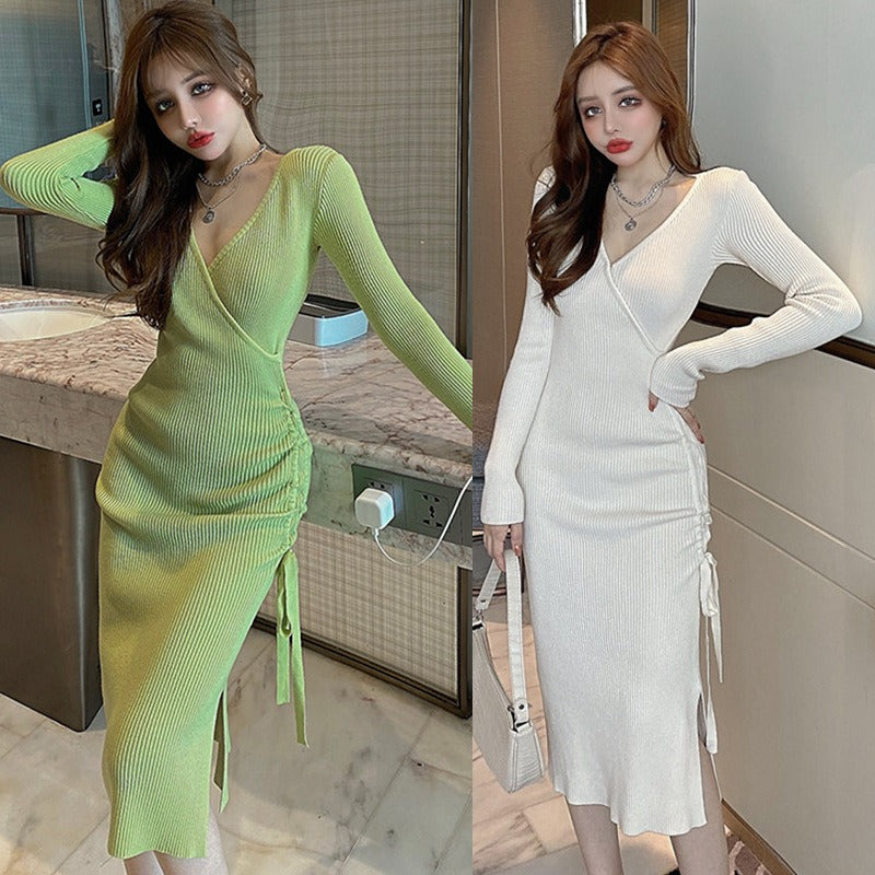 Women Maxi Dress Autumn Winter Sexy Long Sleeve V-neck Knitted Sheath Dress