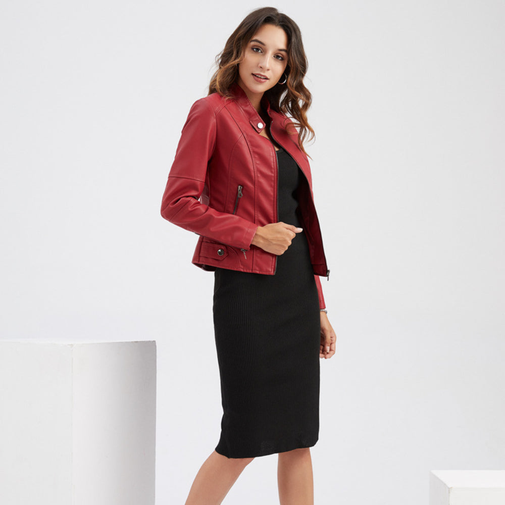 Red Leather Jacket Spring and Autumn Coat Women's Motorcycle Clothing Stand Collar Leather Jacket