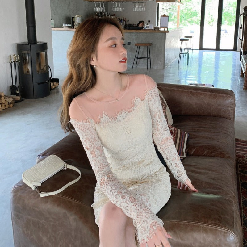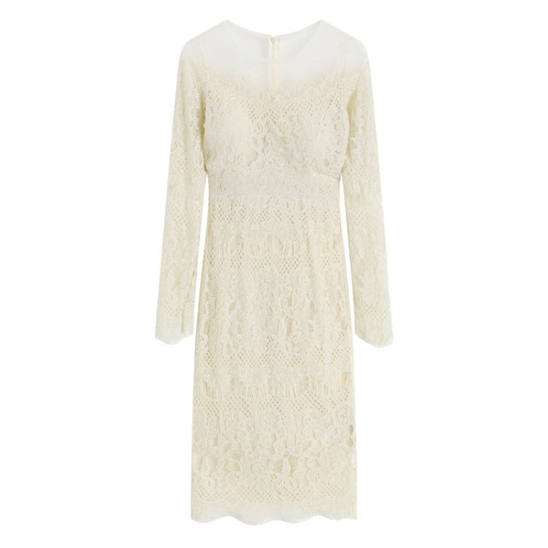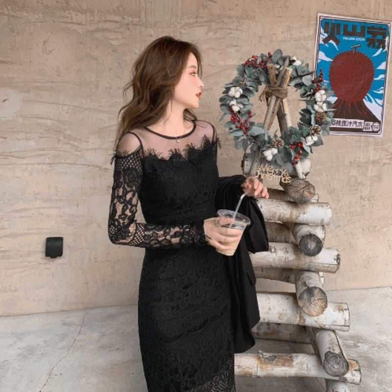 Women Maxi Dress Spring and Autumn Hollow Sexy Lace Evening Dress Hip Skirt