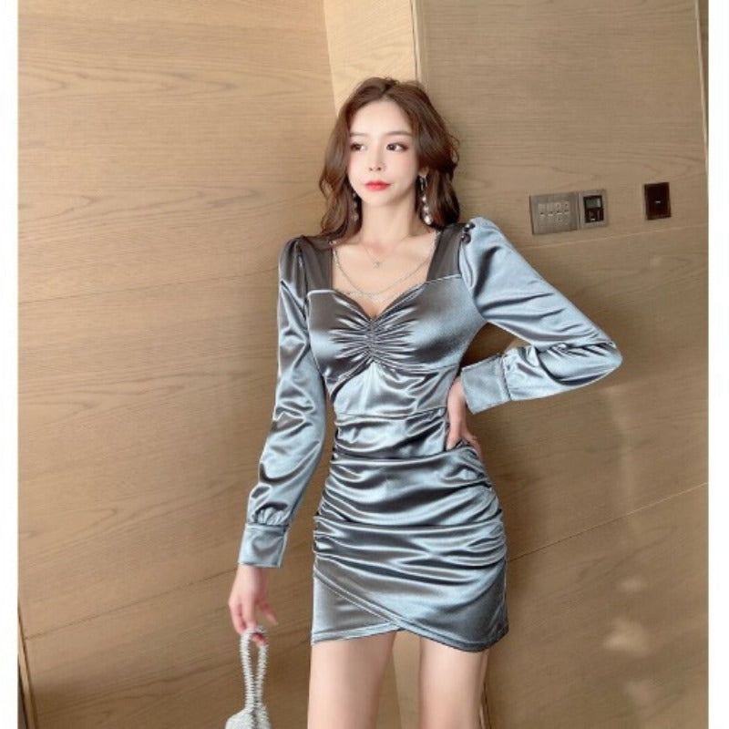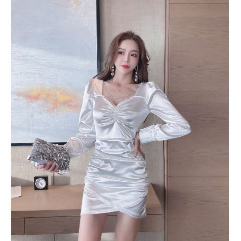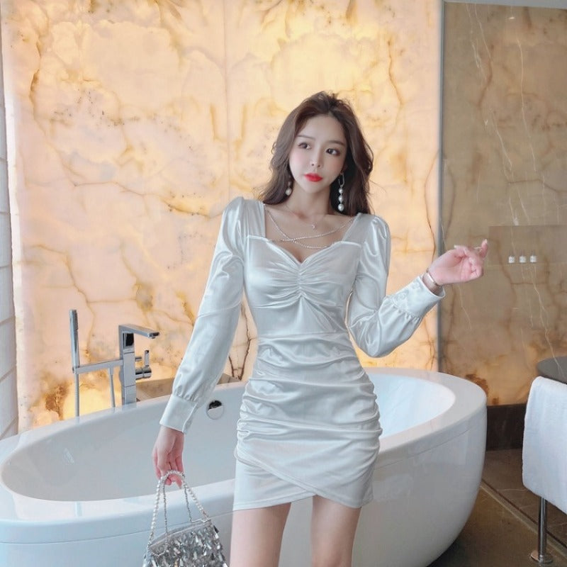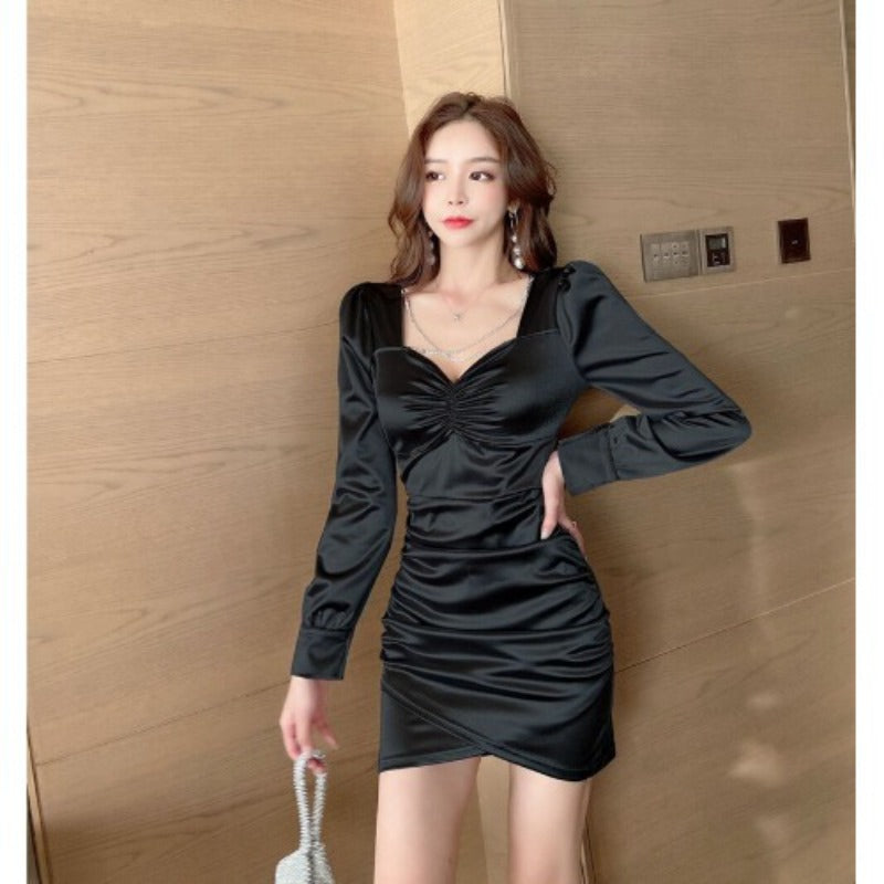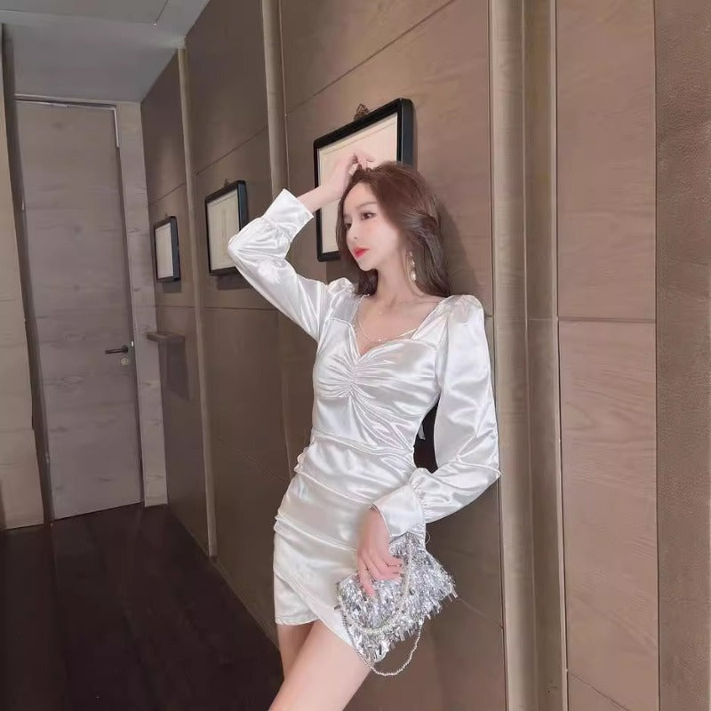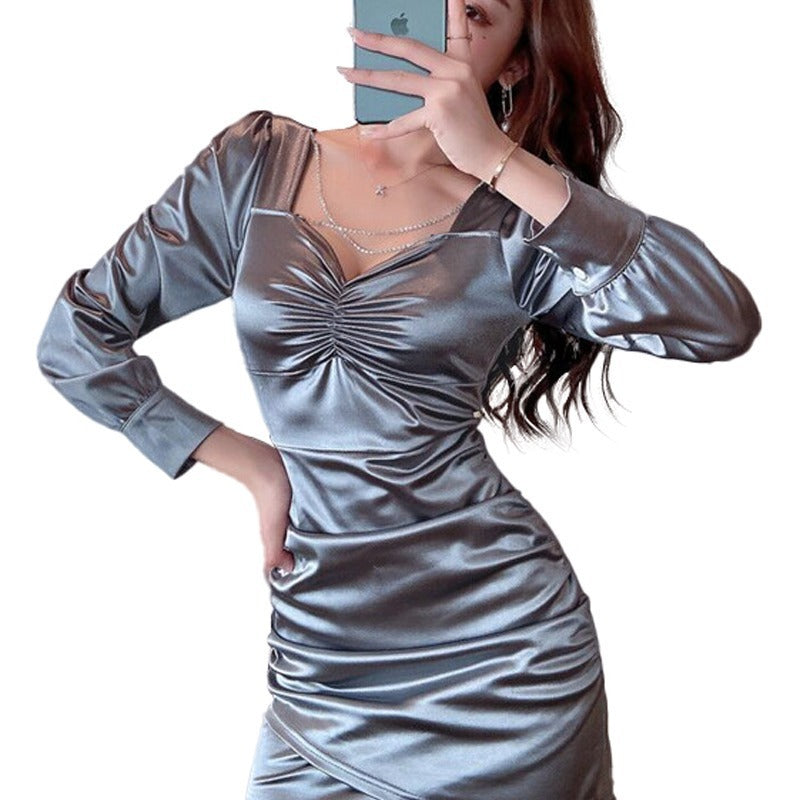 Women Maxi Dress Spring and Autumn Sexy V-neck Puff Sleeve Dress