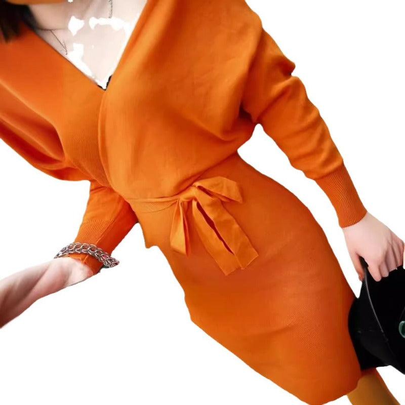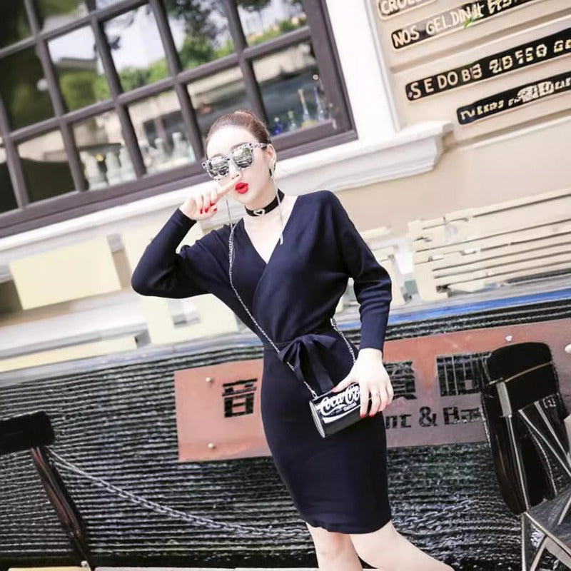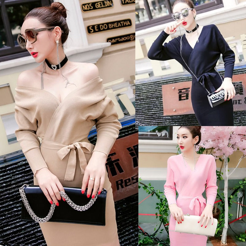 Women Maxi Dress Autumn Winter Sexy Long Sleeve V-neck Knitted Sheath Dress