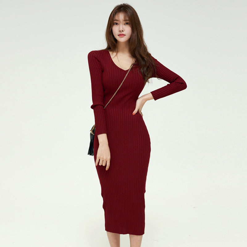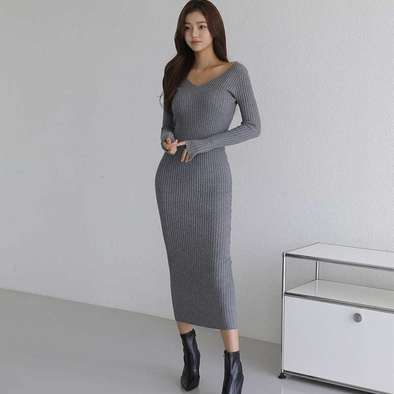 Women Maxi Dress Sexy V-neck Long Sleeve Knitted Dress