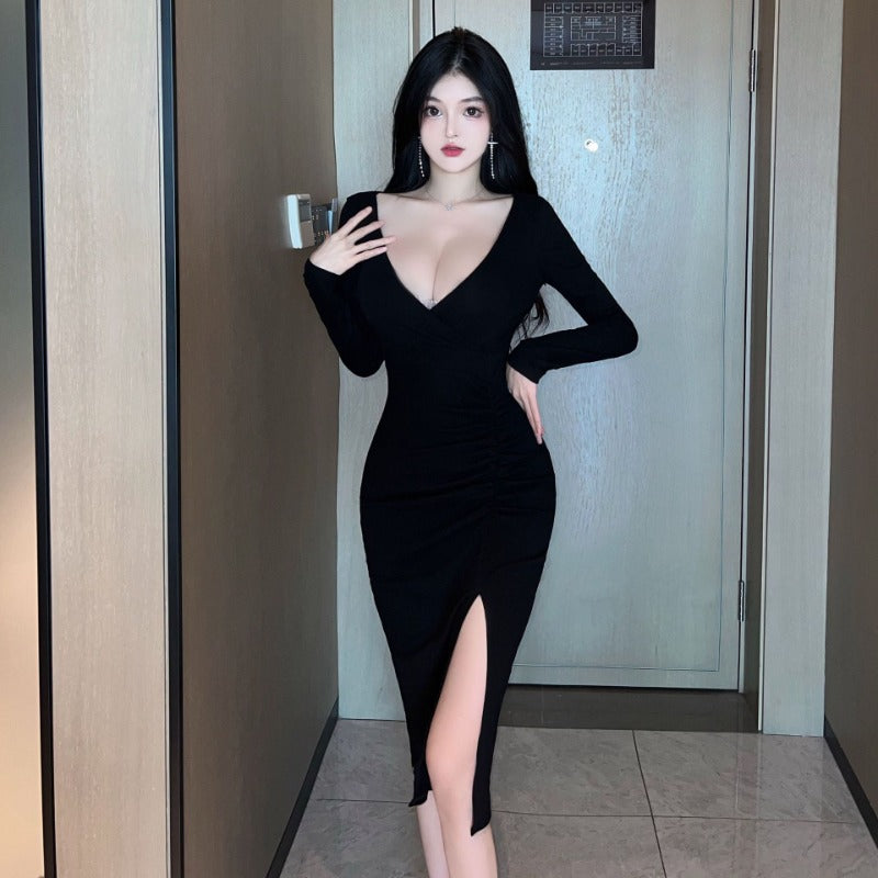 Women Maxi Dress Spring and Autumn Sexy V-neck Hip Dress