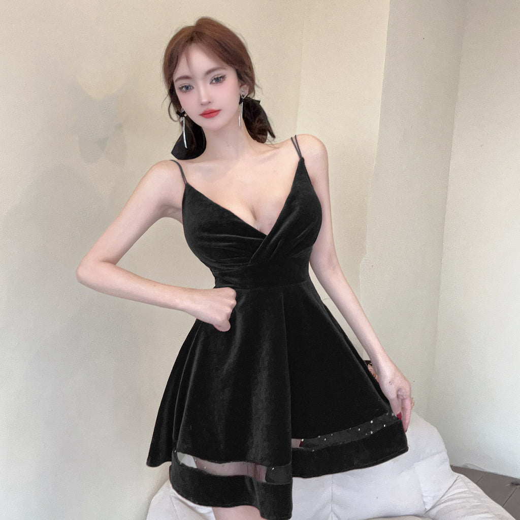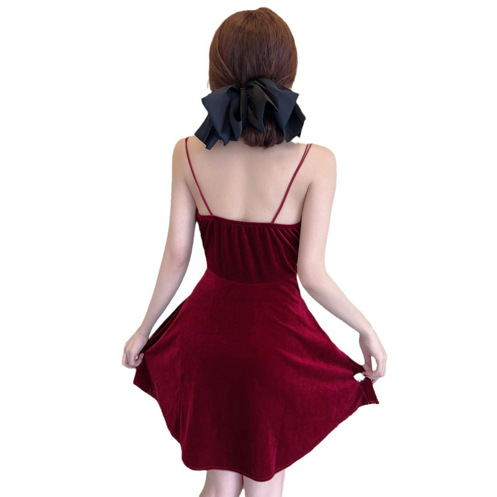 Women Maxi Dress Spring and Autumn Sexy Pleuche Spaghetti-Strap Dress