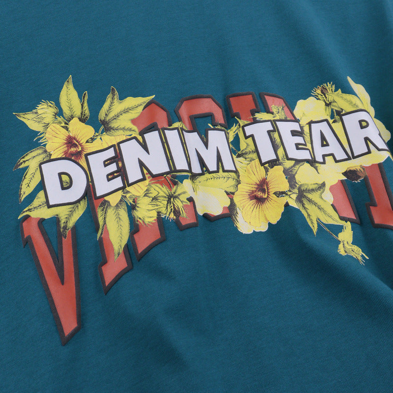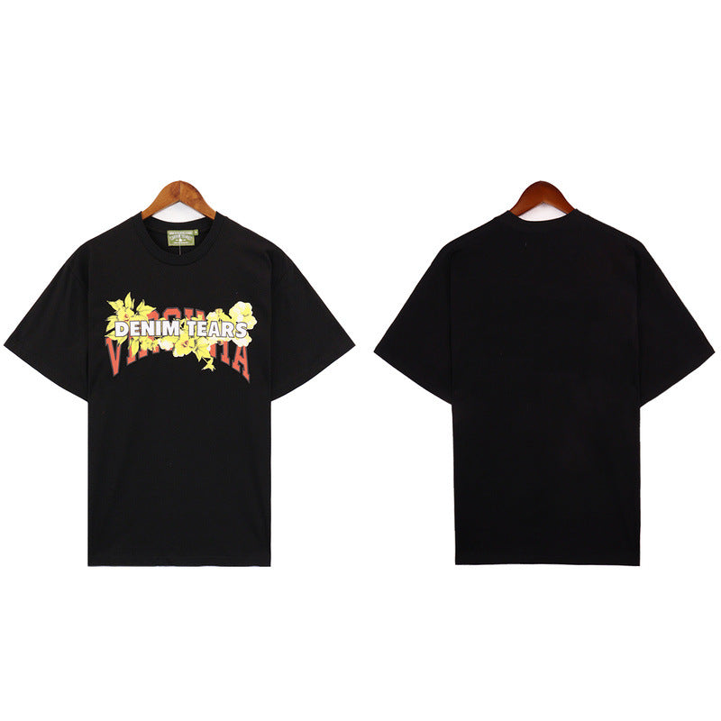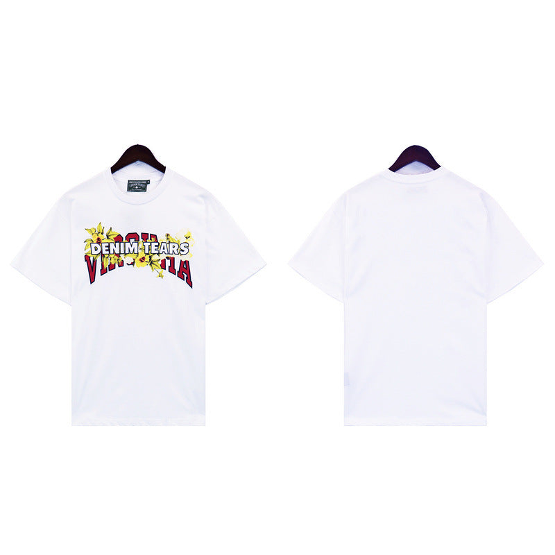 Denim Tears T Shirts Vintage Avatar Oil Painting Flower Letter Printing Men's and Women's Loose Casual Short-Sleeved T-shirt