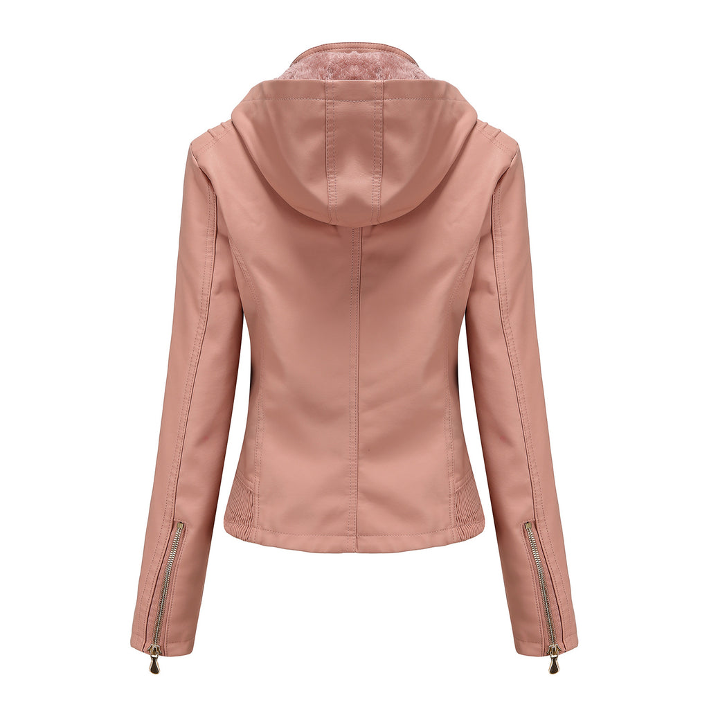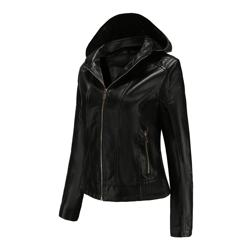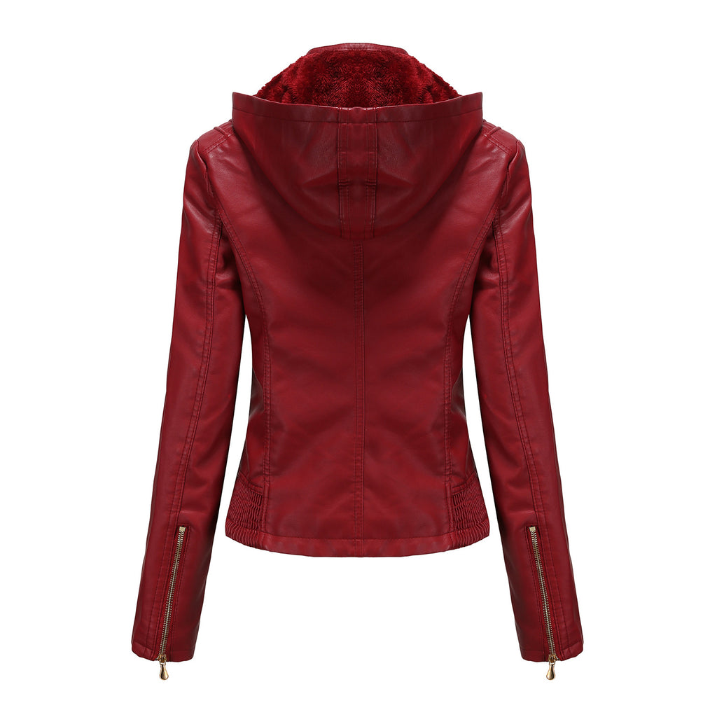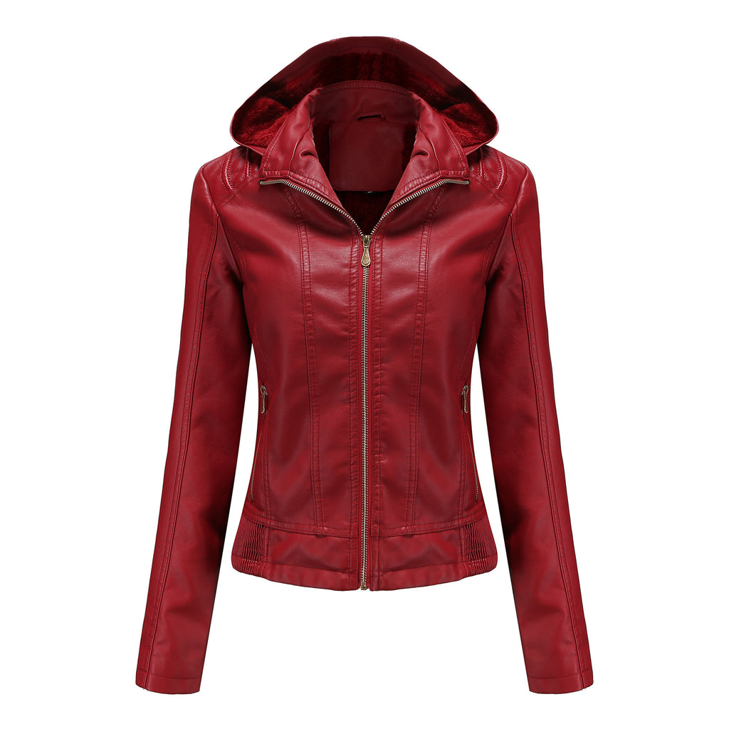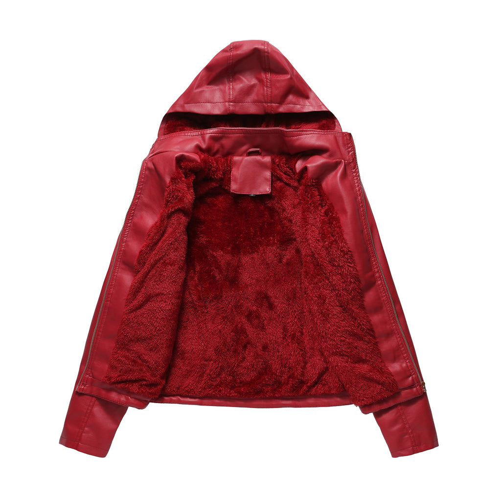 Red Leather Jacket Fall Winter Hooded Leather Women's Detachable Hat Long-Sleeve Zipper Fleece-Lined Wallet