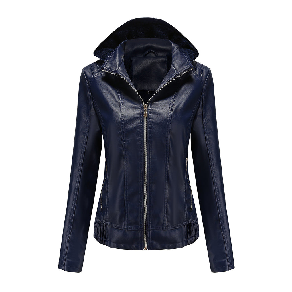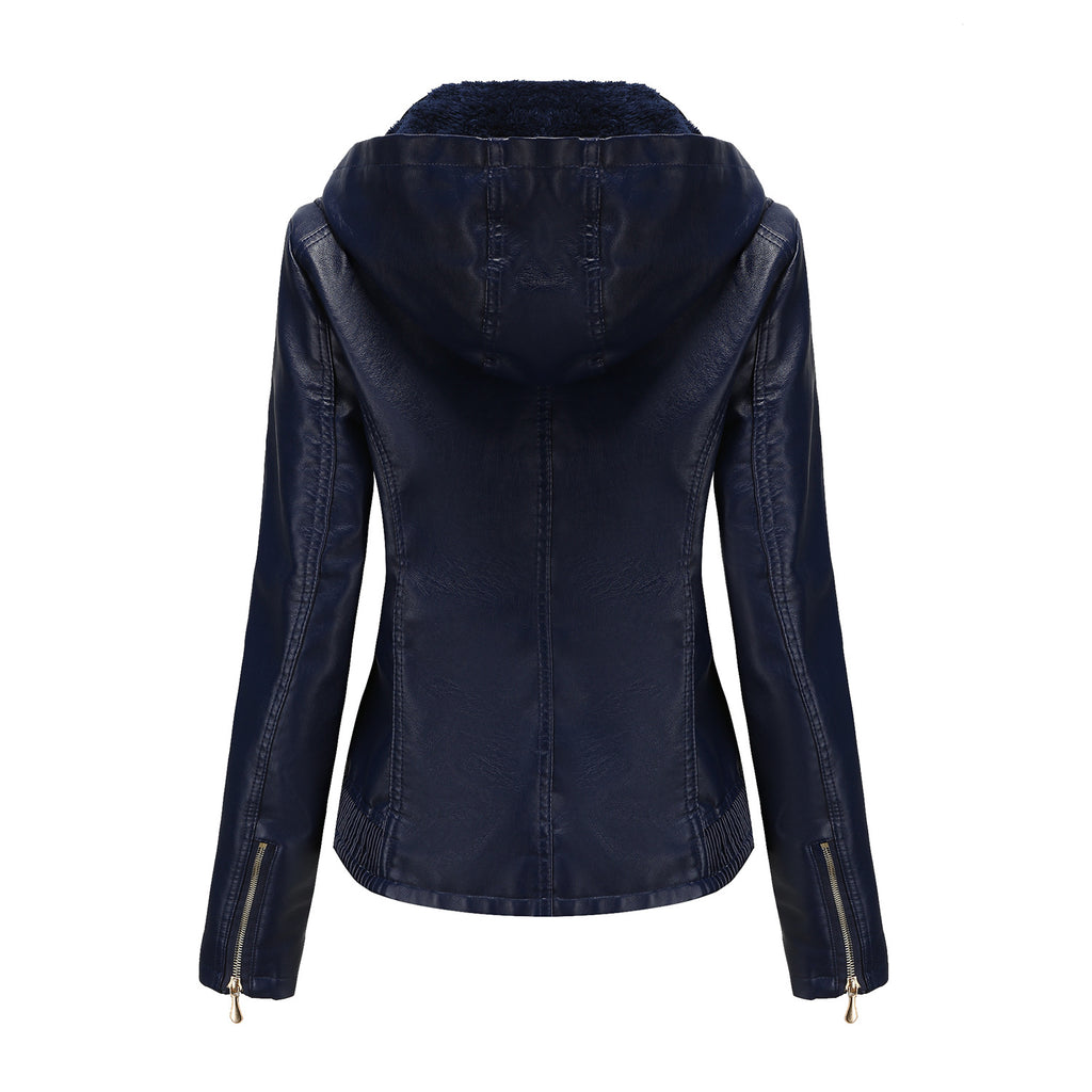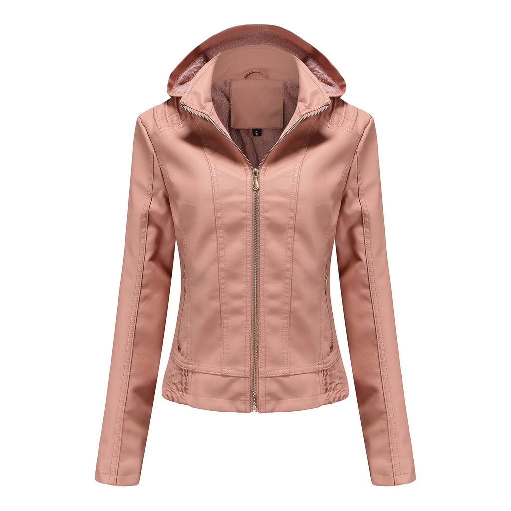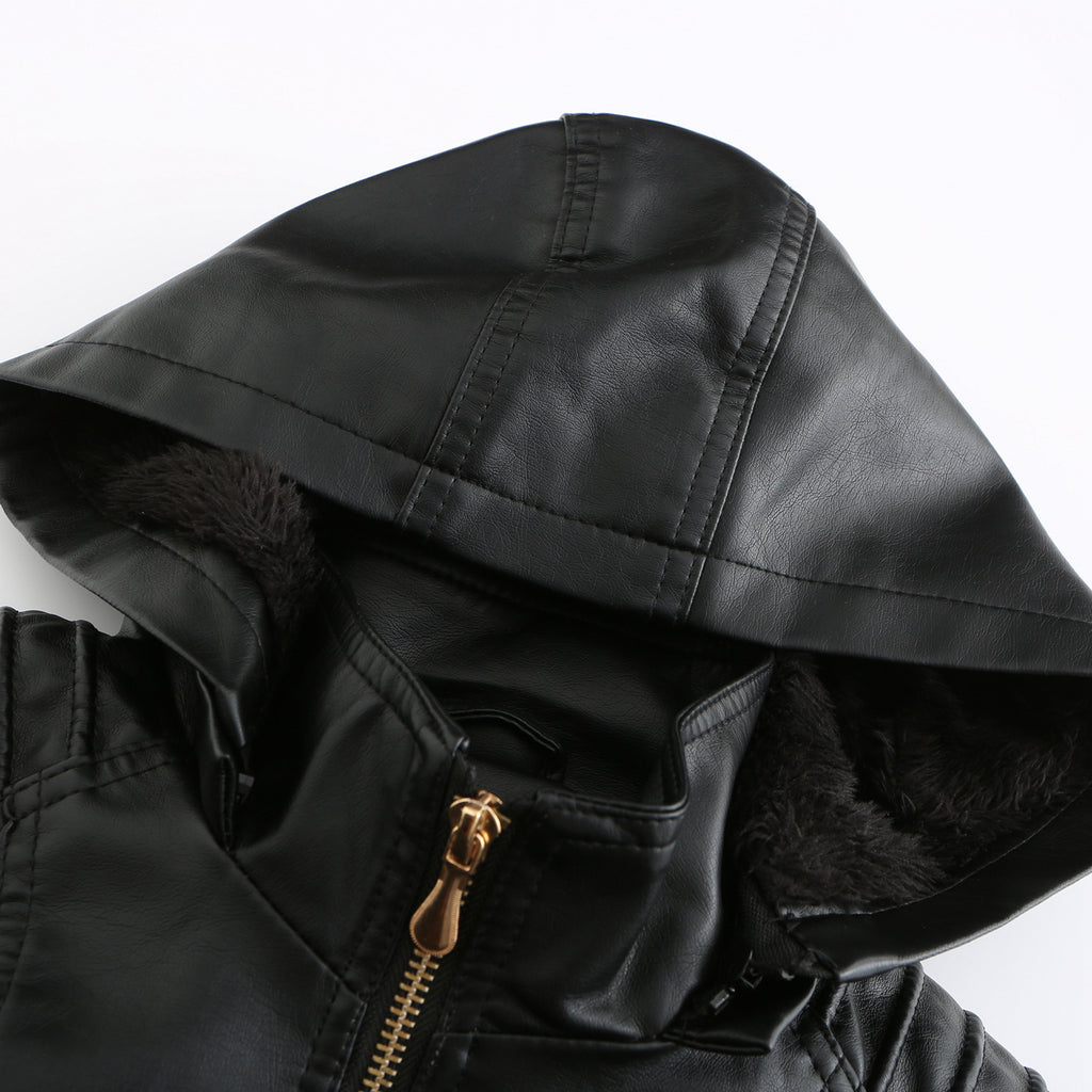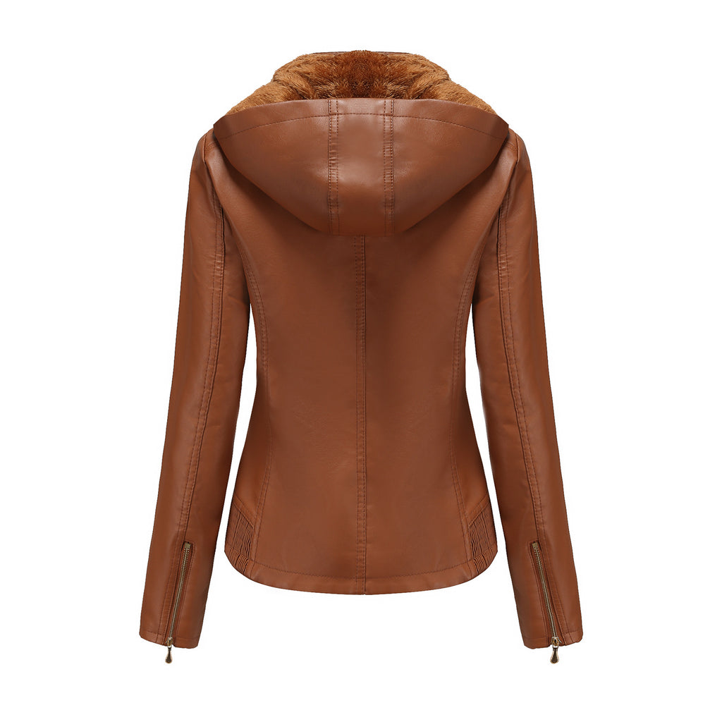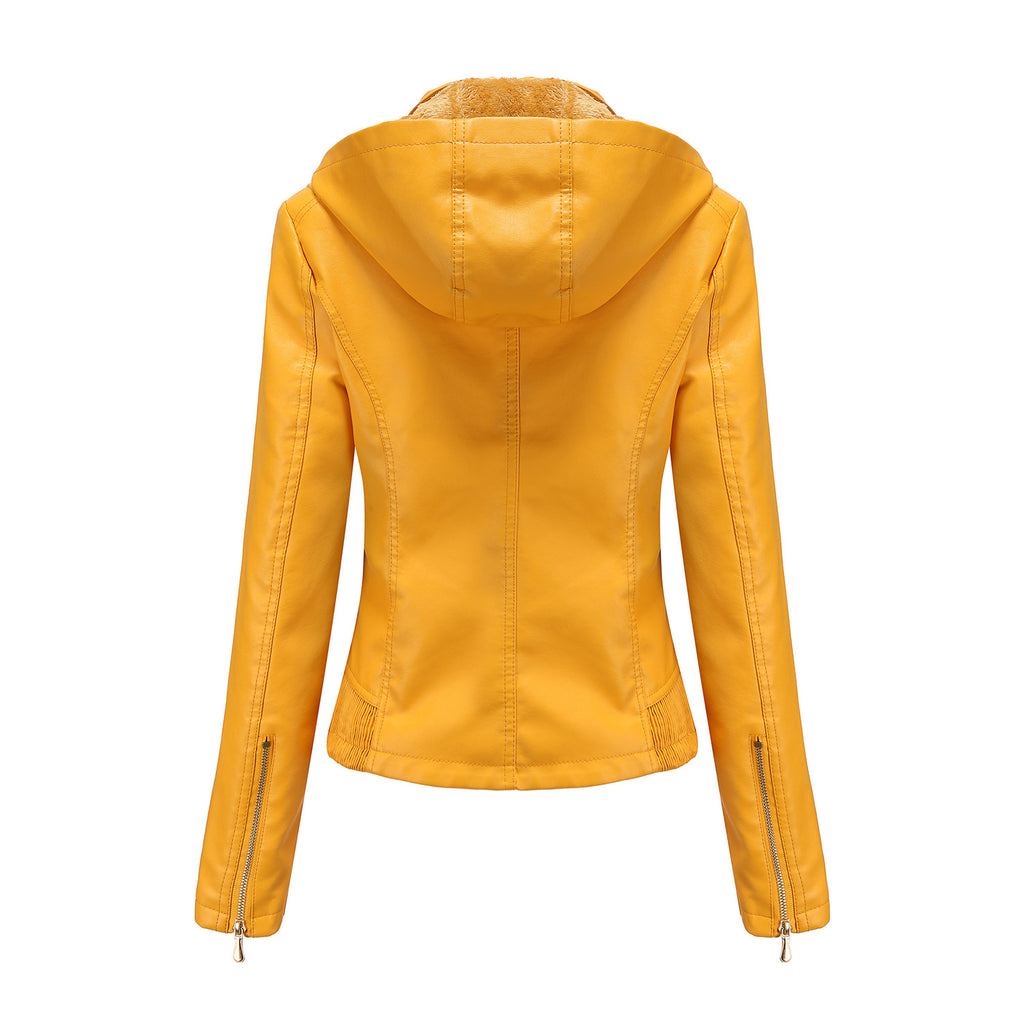 Red Leather Jacket Fall Winter Hooded Leather Women's Detachable Hat Long-Sleeve Zipper Fleece-Lined Wallet
