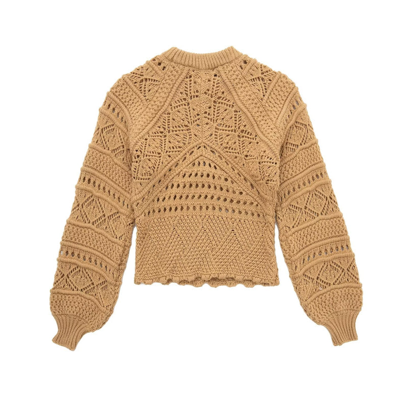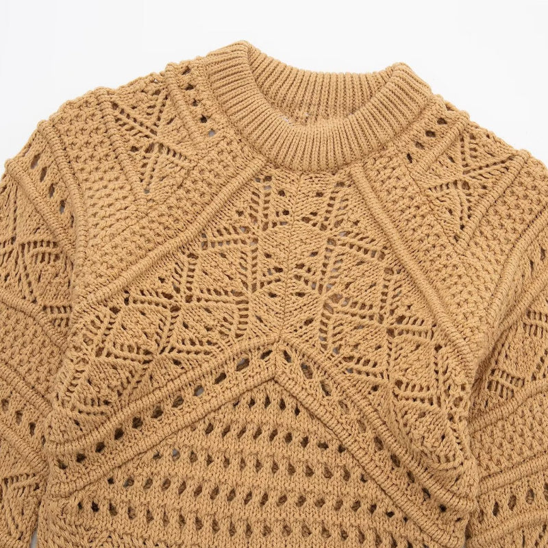 Women Sweater Knitwear Autumn Crew Neck Long Sleeve Vintage Crochet Hollow-out Short Knitwear
