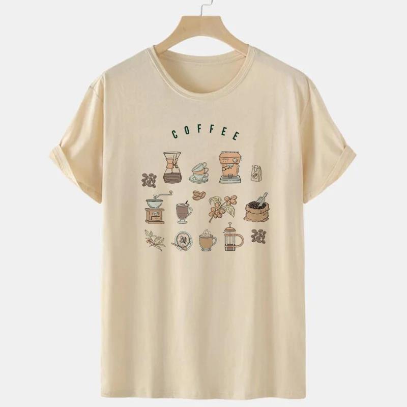 Female Coffee Icons Print T Shirt Summer Casual O-neck Loose